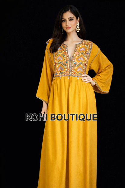 Gjør et varig inntrykk med denne praktfulle afghanske kjolen, rikt dekorert med håndbroderi, speilarbeid og tradisjonelle detaljer. Kjolen har sterke, vakre farger og et autentisk uttrykk som gjenspeiler afghansk kultur og håndverkstradisjon.