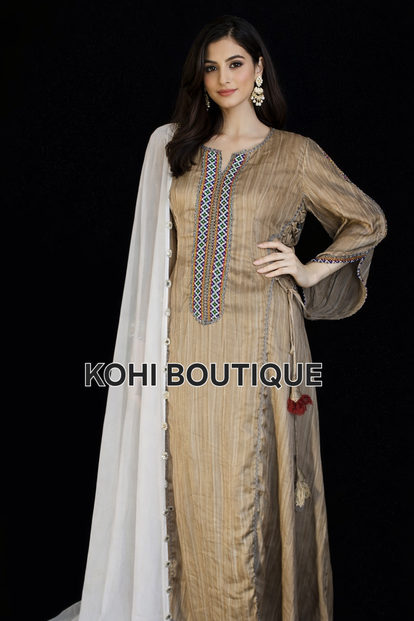 En eksklusiv afghansk kjole som kombinerer tidløst håndverk med sofistikert design. Kjolen er rikt dekorert med tradisjonelt broderi, fine detaljer og dekorative elementer som gir et autentisk og luksuriøst uttrykk.
