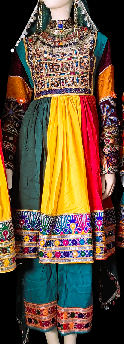Denne unike afghanske kjolen er et ekte blikkfang, rikt dekorert med håndbroderi, speilarbeid og tradisjonelle detaljer. Den harmoniske kombinasjonen av grønt, gult og rødt gir et kraftfullt og elegant uttrykk. Kjolen leveres med matchende bukse og slør for et komplett, autentisk antrekk.