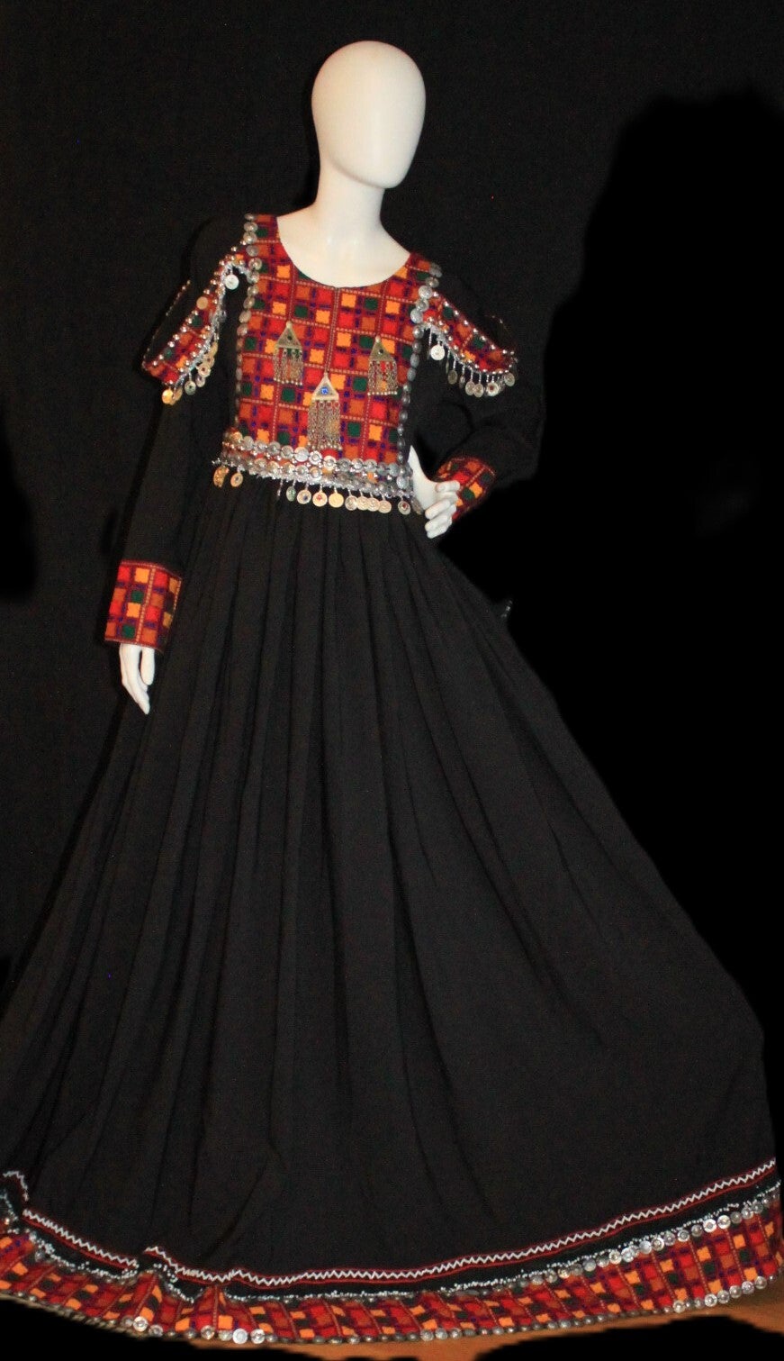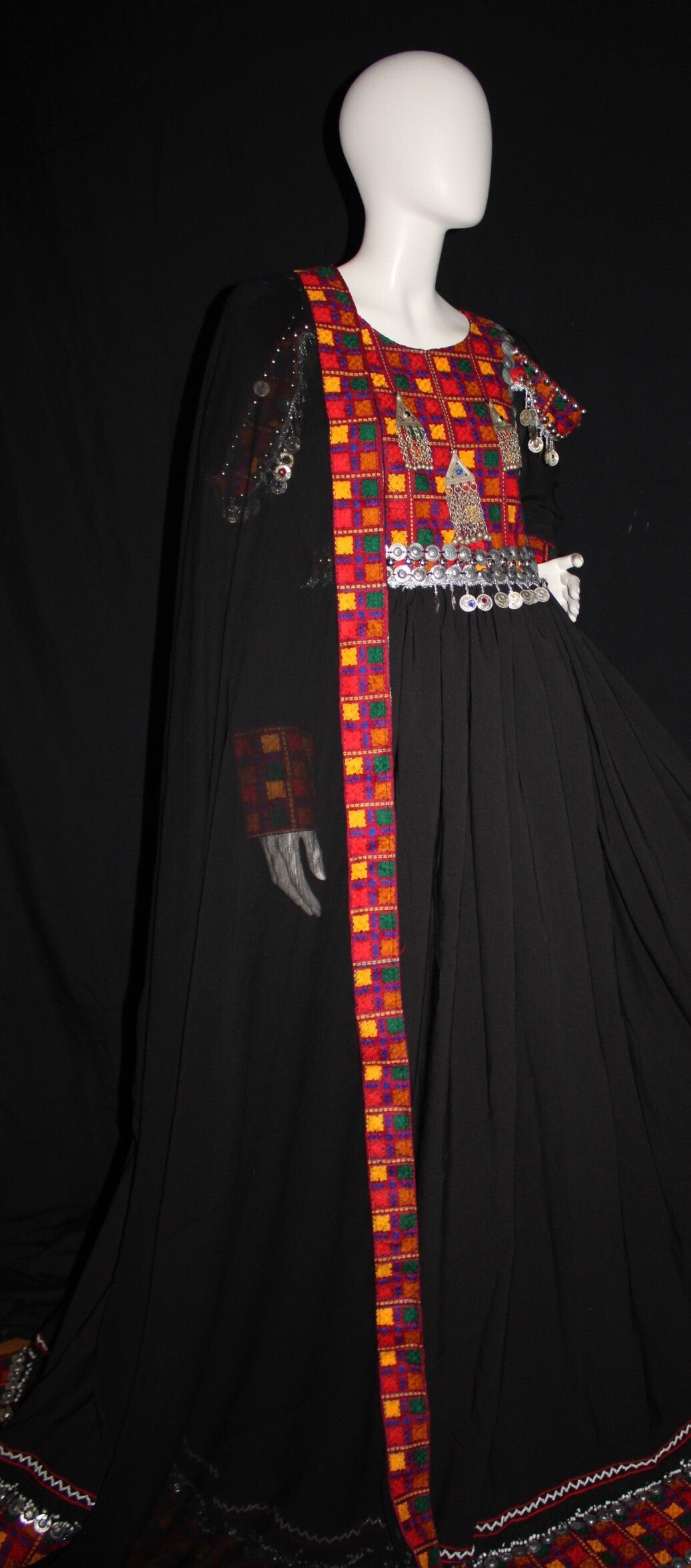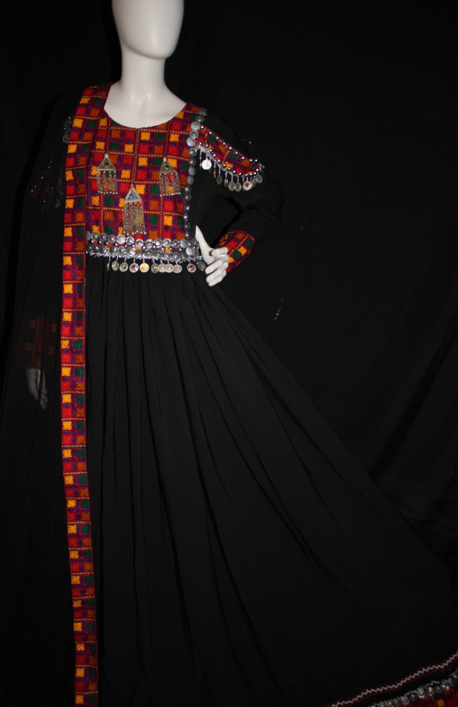Kjolen er rikt dekorert med fargerikt håndbroderi, klassiske mønstre og dekorative mynter som gir et autentisk og eksklusivt uttrykk.Laget av kvalitetsstoff med nøye utført håndarbeid, er dette et plagg som utstråler både kulturarv og høy kvalitet. Hver detalj er gjennomarbeidet for å gi komfort, holdbarhet og et unikt design.
