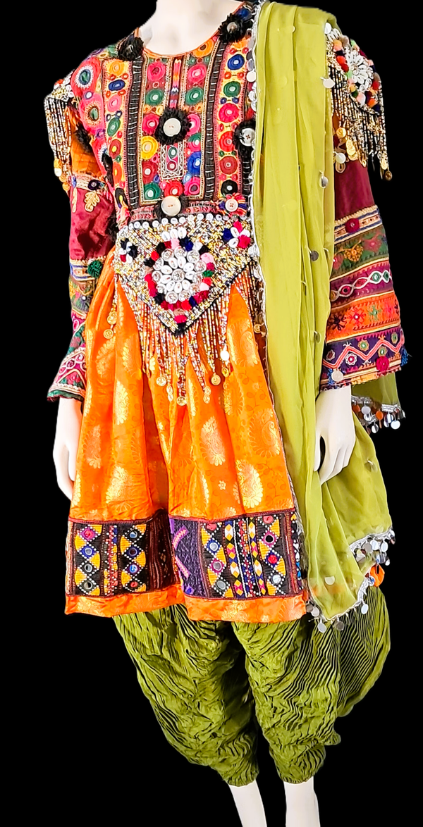 Iøynefallende afghansk kjole med detaljert broderi, speil- og myntdekorasjoner og vakre, sterke farger. Kjolen har et tradisjonelt design med kortere overdel, dekorert belte og mykt fall som gir et eksklusivt og festklart uttrykk. Leveres med matchende bukse og sjal for et komplett antrekk.