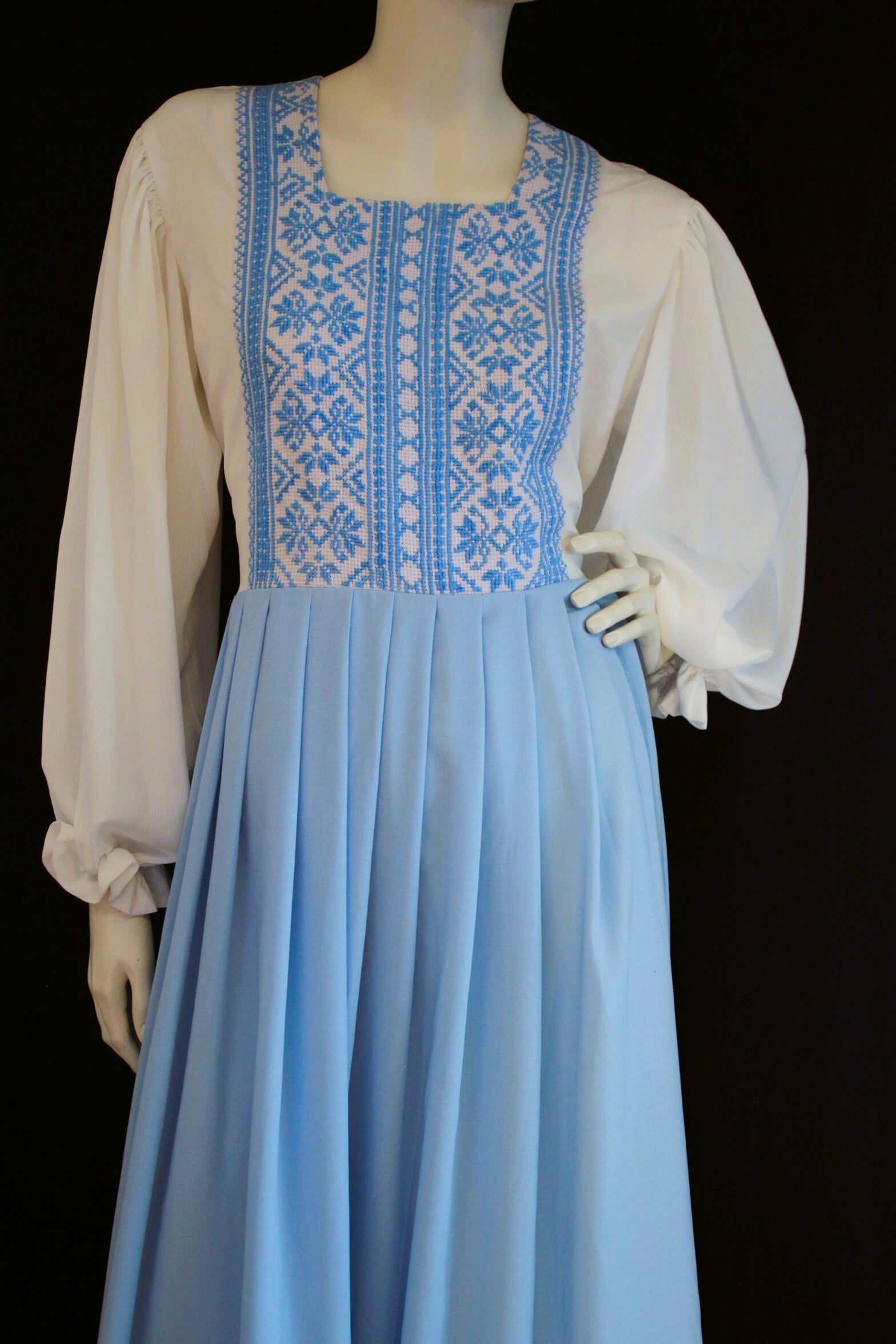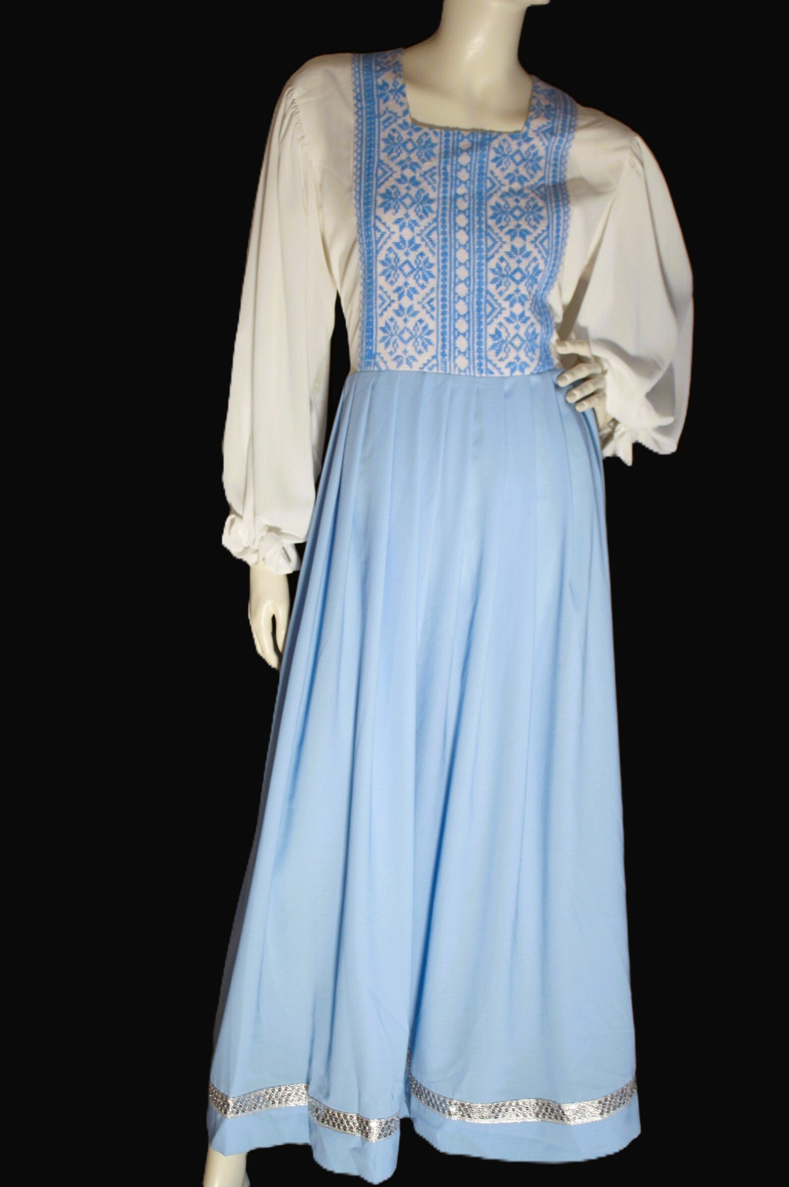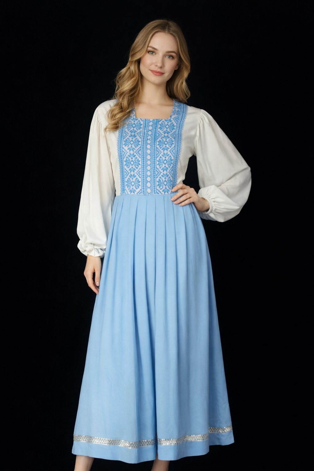 Eksklusiv afghansk kjole i hvitt og lyseblått, dekorert med vakkert håndbroderi på overdelen. Kjolen har lange ermer, elegant snitt og et lett, flytende skjørt som gir et sofistikert og tidløst uttrykk.