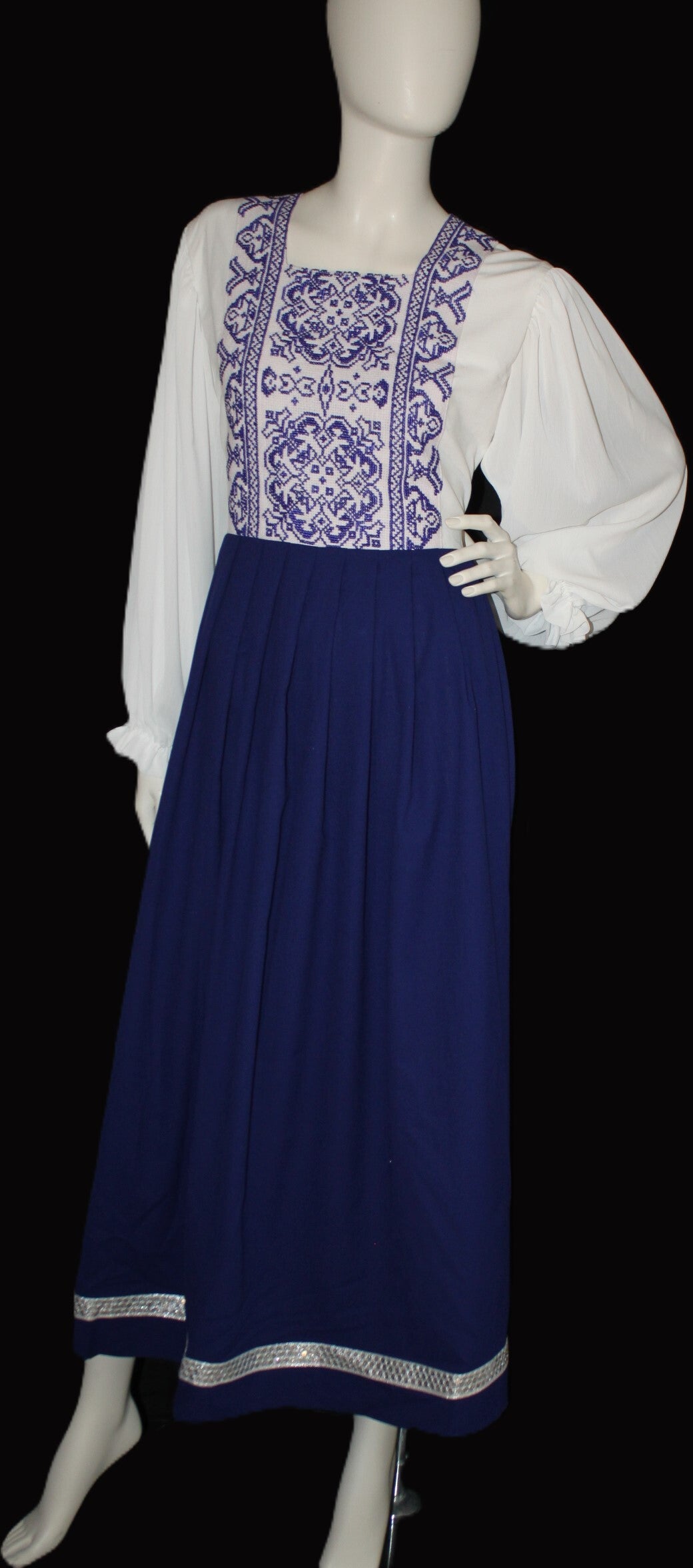 Vakker kjole med eksklusivt håndbrodert mønster på overdelen. Myk, luftig passform med lange ermer og elegant skjørt som faller pent. Perfekt til fest, kulturarrangementer eller spesielle anledninger.