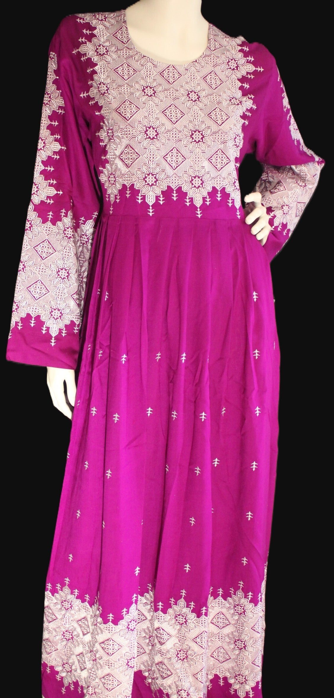 En vakker og feminin kjole i dyp lillafarge, dekorert med detaljert maskinbroderi på bryst, ermer og nederkant. Kjolen har lange ermer, flatterende snitt i midjen og et lett, flytende skjørt som gir komfort og eleganse.