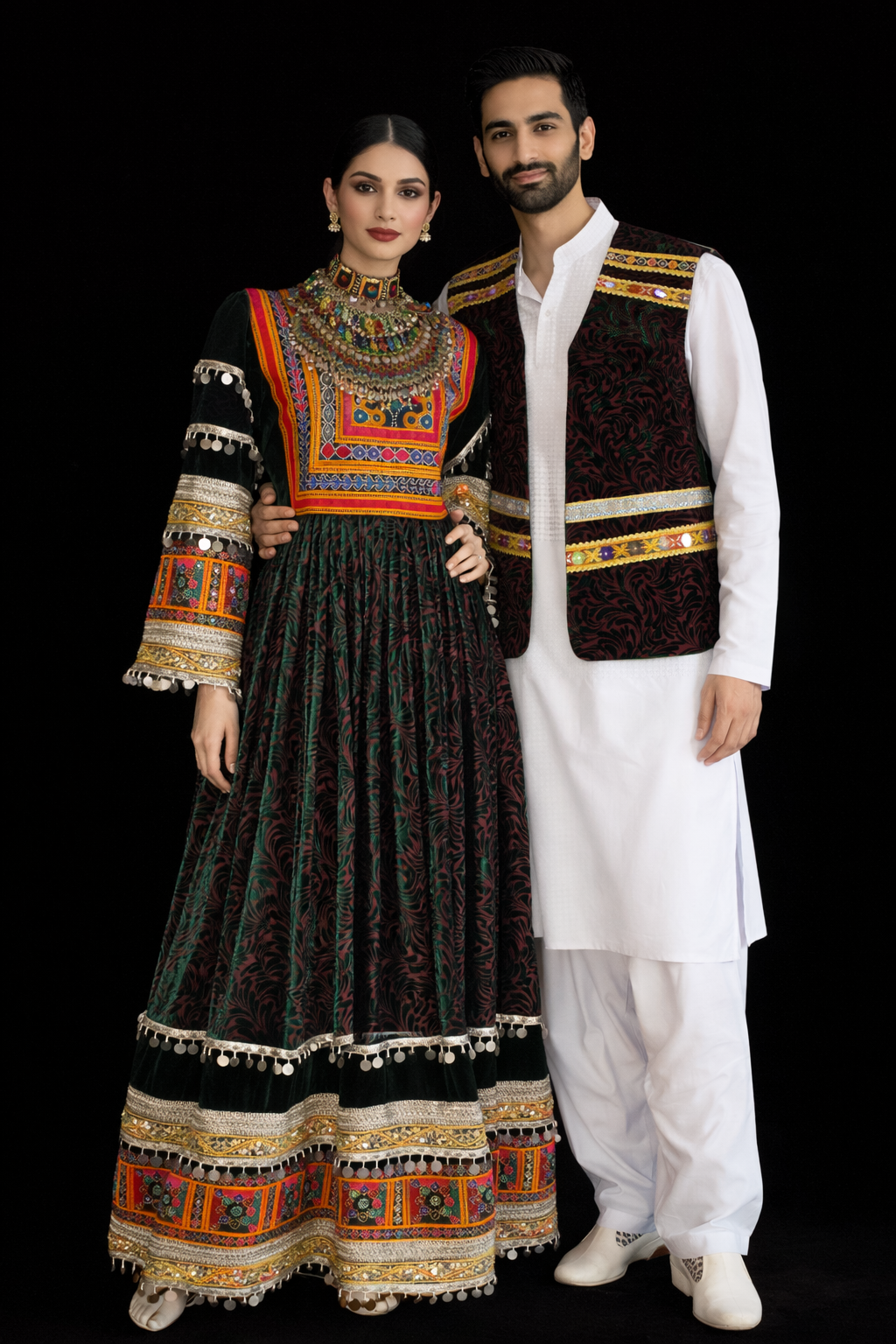 Et eksklusivt og elegant sett bestående av rikt dekorert kjole og matchende herrevest. Inspirert av afghansk tradisjon, med vakre farger, broderte detaljer og et luksuriøst uttrykk.