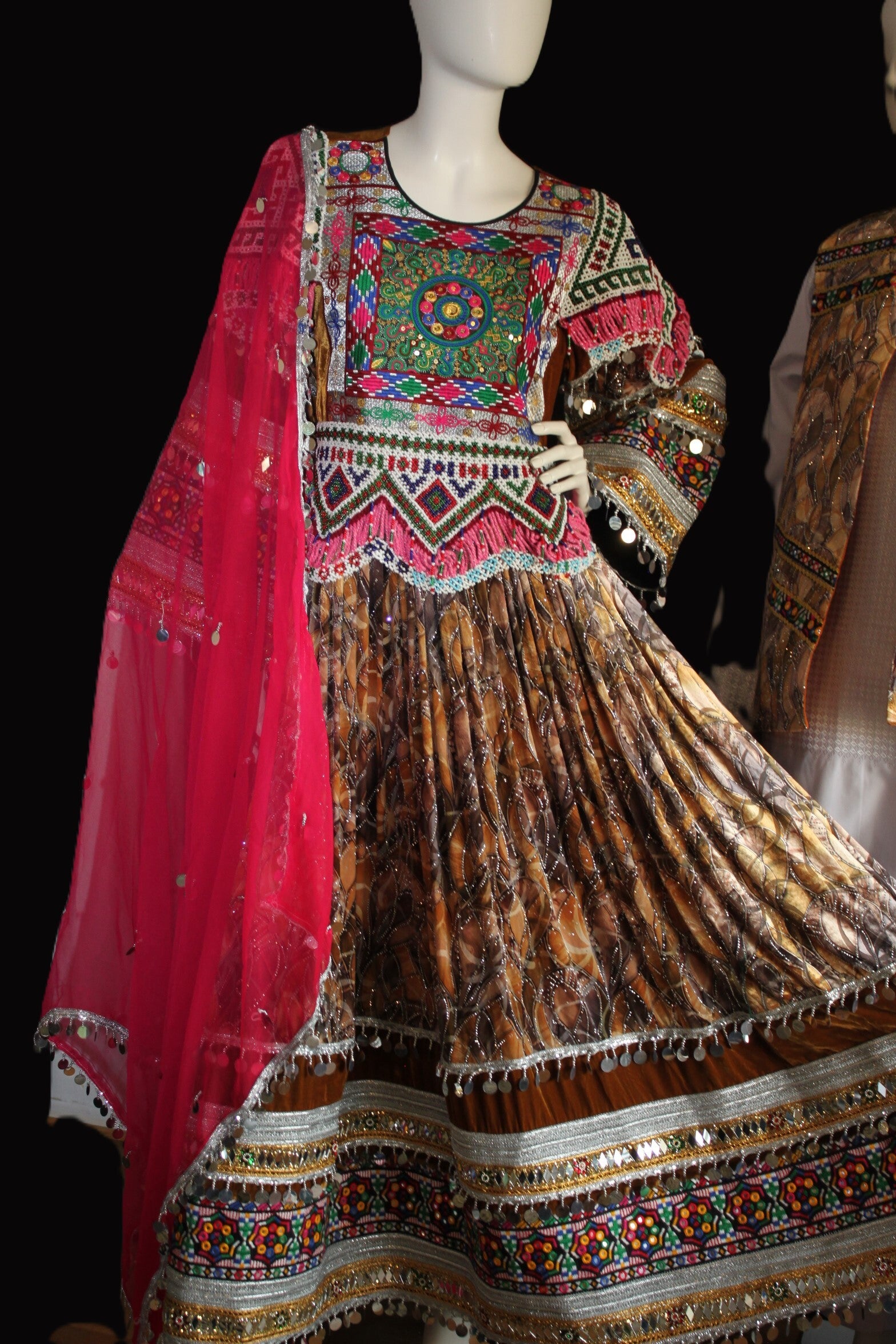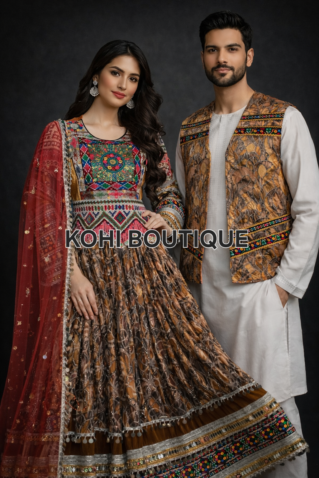 Et imponerende og rikt dekorert sett bestående av kjole, matchende sjal og herrevest. Kjolen er utsmykket med detaljerte broderier, speilarbeid og dekorative bånd som gir et autentisk og elegant uttrykk. Sjalet kompletterer antrekket med lett fall og glitrende detaljer, mens herrevesten er designet i matchende mønster for et helhetlig og stilfullt uttrykk.