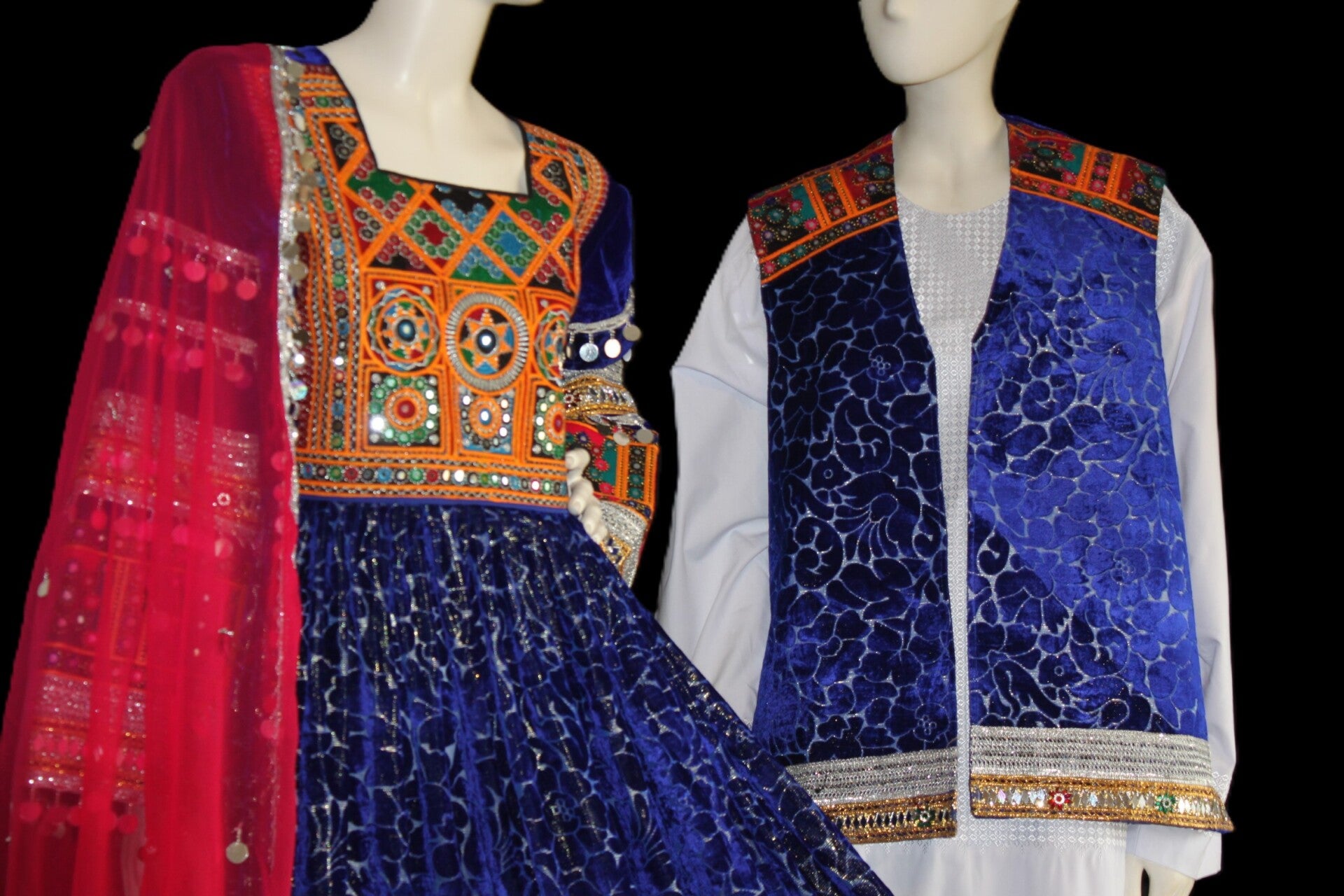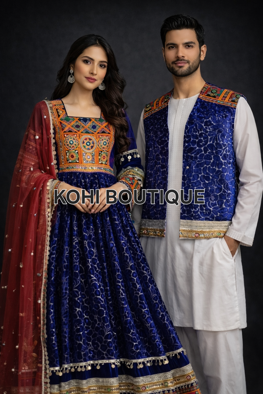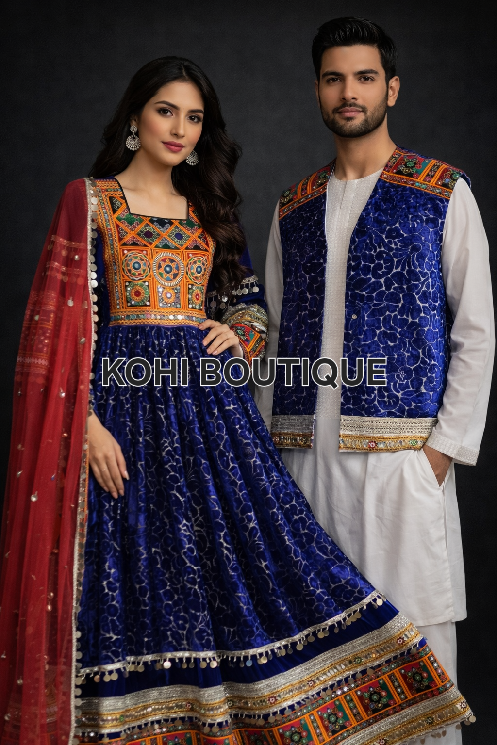 Et elegant og autentisk afghansk sett bestående av tradisjonell kjole, matchende sjal og herrevest. Kjolen er rikt dekorert med detaljerte broderier, speilarbeid og ornamenter som gir et luksuriøst og kulturelt uttrykk. Det lette sjalet kompletterer antrekket med et sofistikert preg, mens herrevesten er designet i harmonerende farger og mønstre for et helhetlig og stilfullt sett.