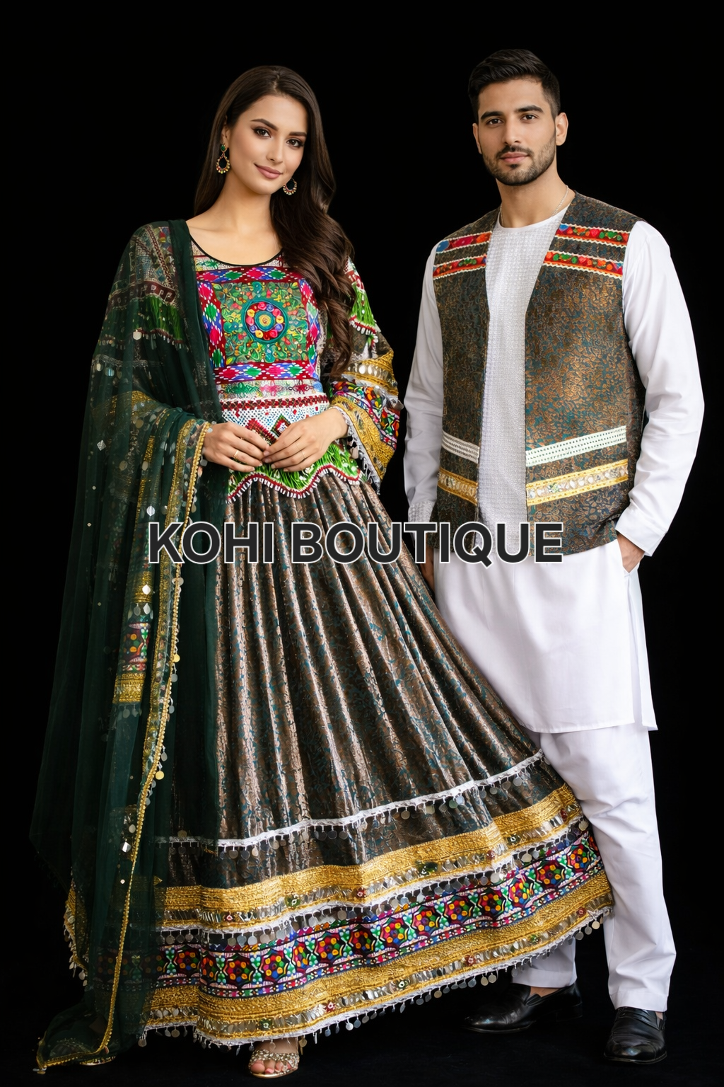 Et eksklusivt og tradisjonsrikt afghansk sett som kombinerer håndverk, farger og kultur i perfekt harmoni. Settet består av en vakkert dekorert afghansk kjole med detaljerte broderier og ornamenter, matchende sjal samt en elegant herrevest i samme stil.