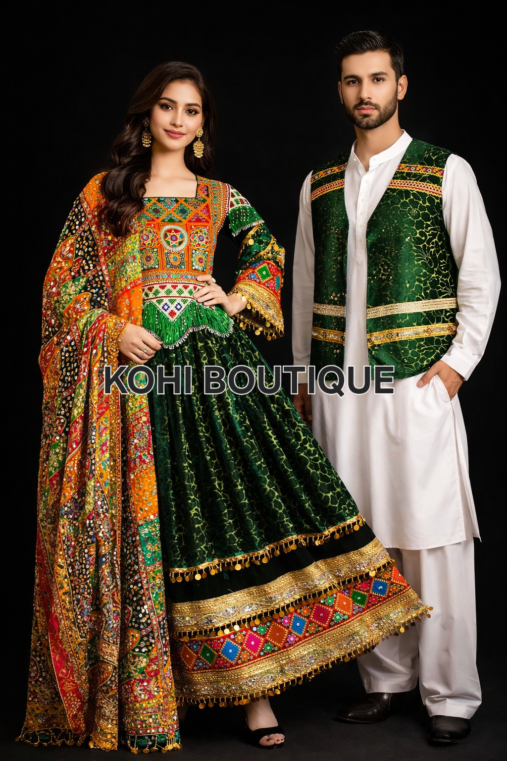 Et eksklusivt komplett afghansk sett som forener tradisjonelt håndverk, sterke farger og luksuriøse detaljer. Dette settet er nøye sammensatt for å gi et helhetlig og imponerende uttrykk – perfekt for høytidelige anledninger.