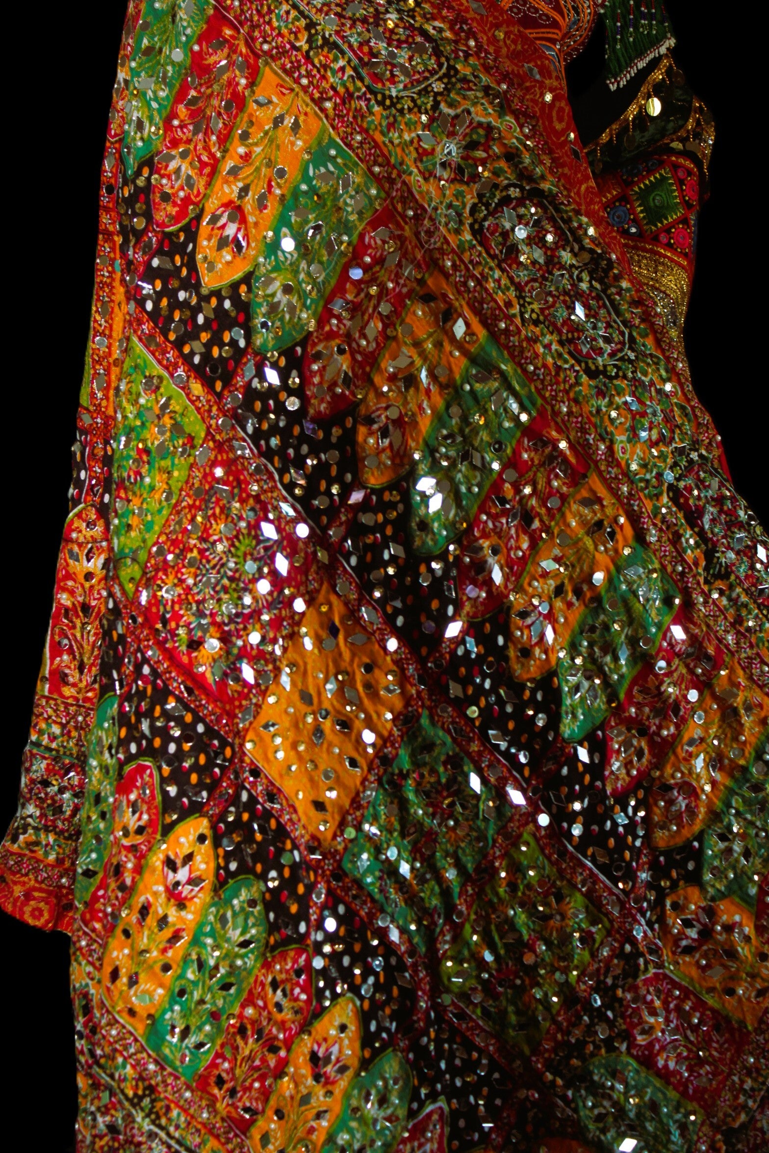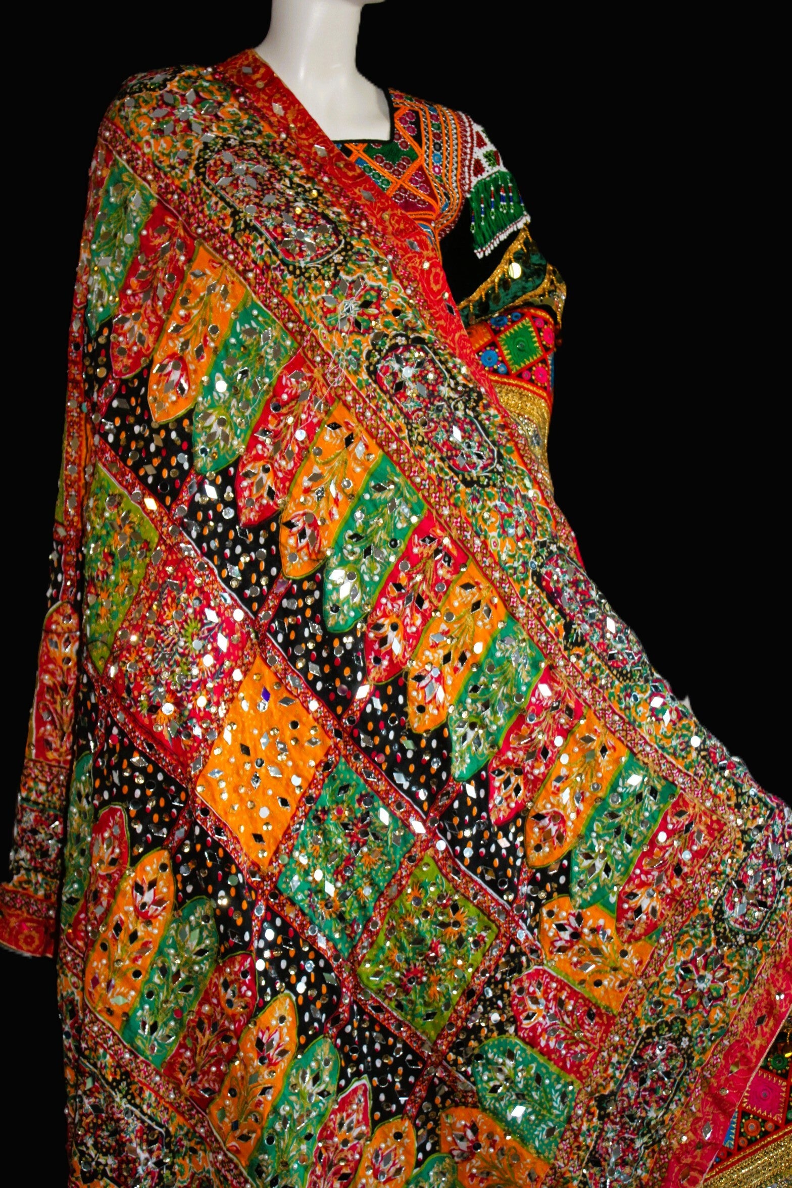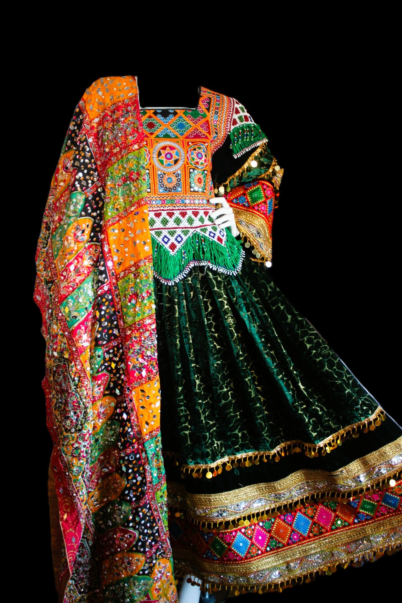 Afghansk kjole med rikt broderte mønstre, speil- og detaljer samt elegant vidde