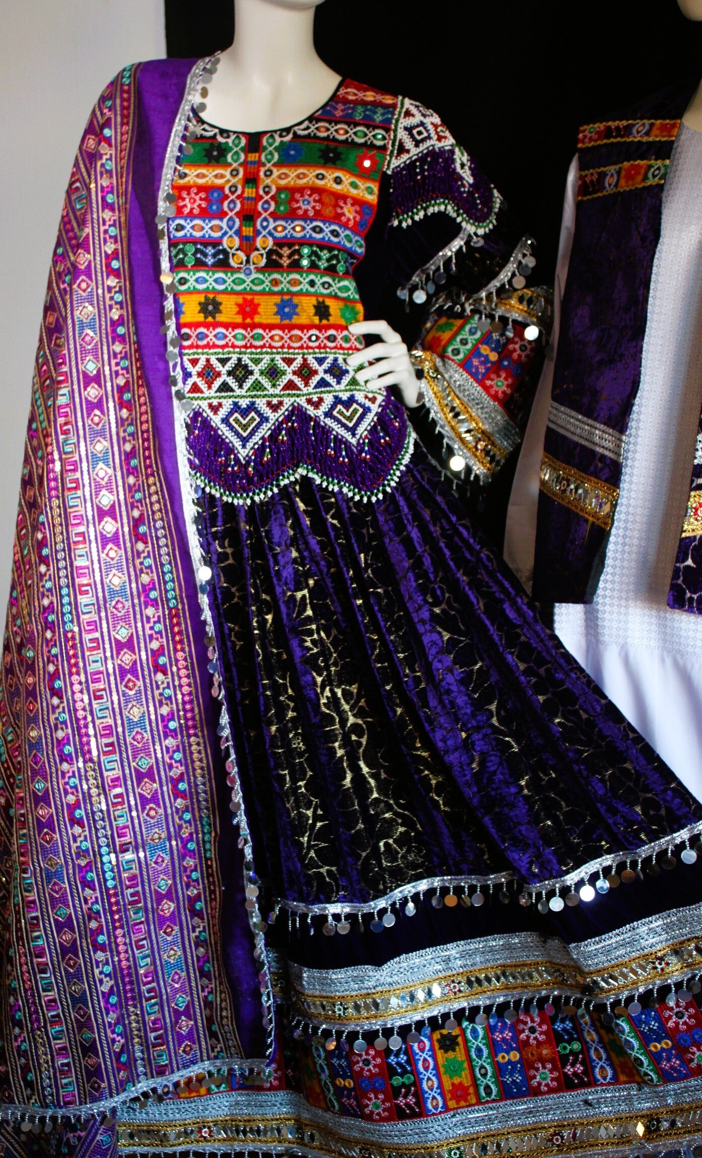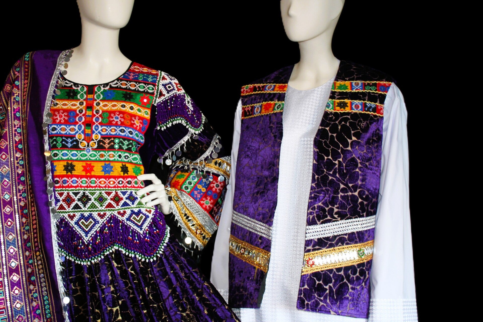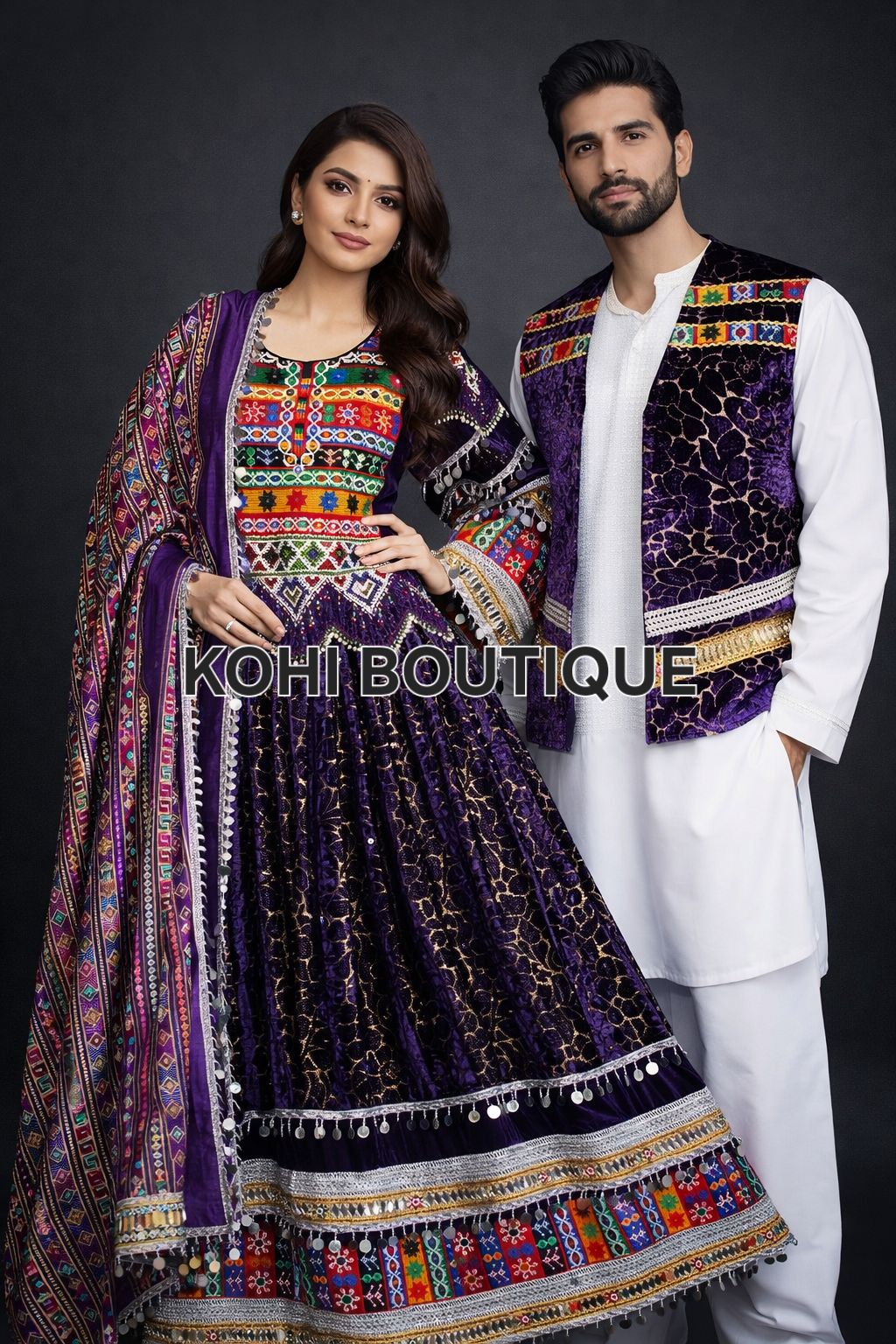 Kjolen er utsmykket med detaljerte broderier, ornamenter, speil- og myntdetaljer samt tradisjonelle mønstre som gjenspeiler afghansk kulturarv. Det tilhørende sjalet er elegant dekorert og gir antrekket et sofistikert preg. Herrevesten er designet i matchende farger og mønstre, og fullfører settet med et klassisk og tradisjonelt uttrykk.