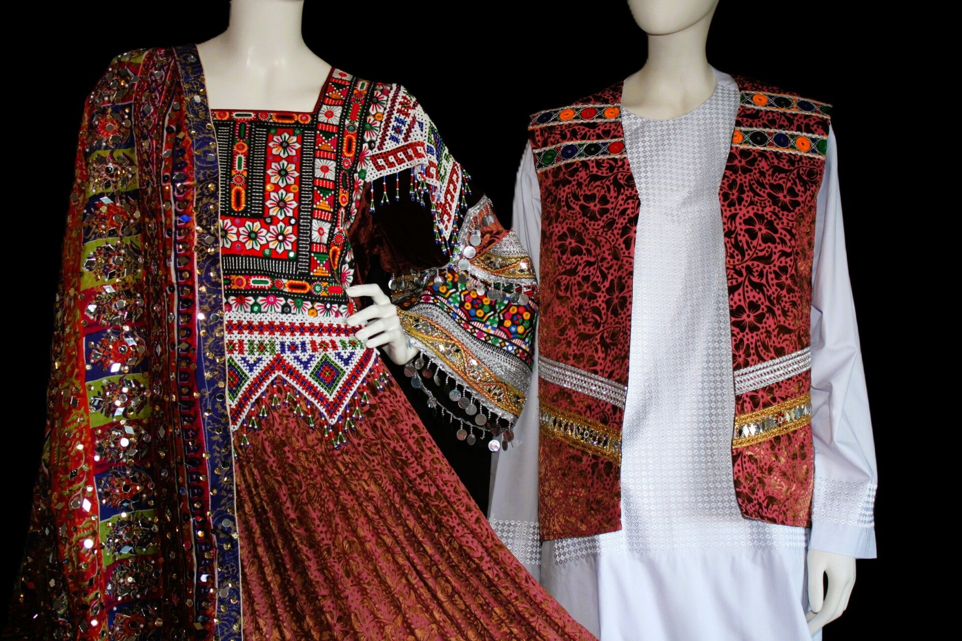 Settet er rikt dekorert med detaljerte broderier, speilornamenter og klassiske mønstre som gjenspeiler Afghanistans stolte kulturarv.