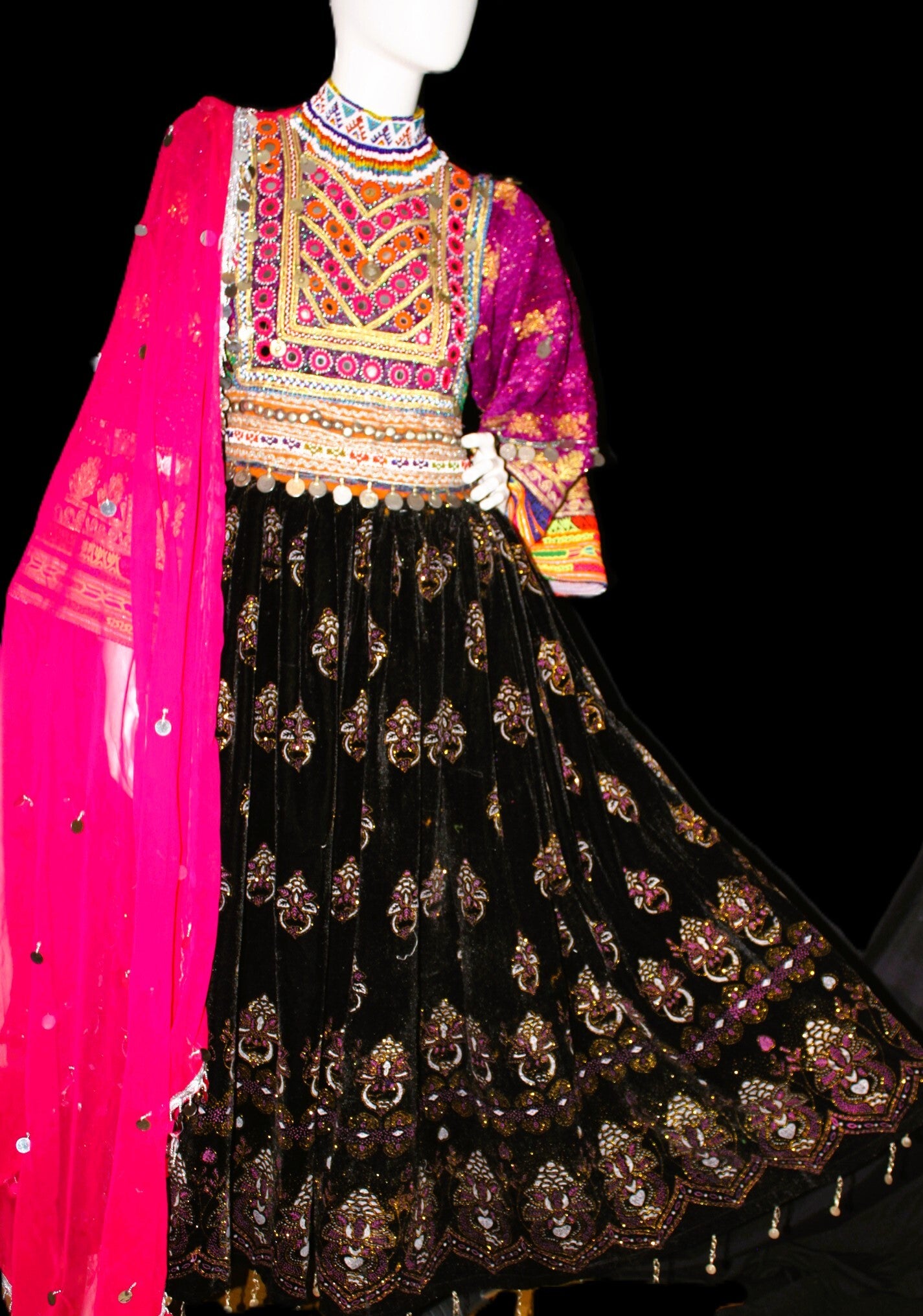 Kjolen er utsmykket med detaljerte håndbroderier, speilarbeid og dekorative mønstre som gir et luksuriøst og autentisk uttrykk. Det fyldige skjørtet i mykt stoff gir en vakker bevegelse, mens overdelen er rikt dekorert for et elegant blikkfang.