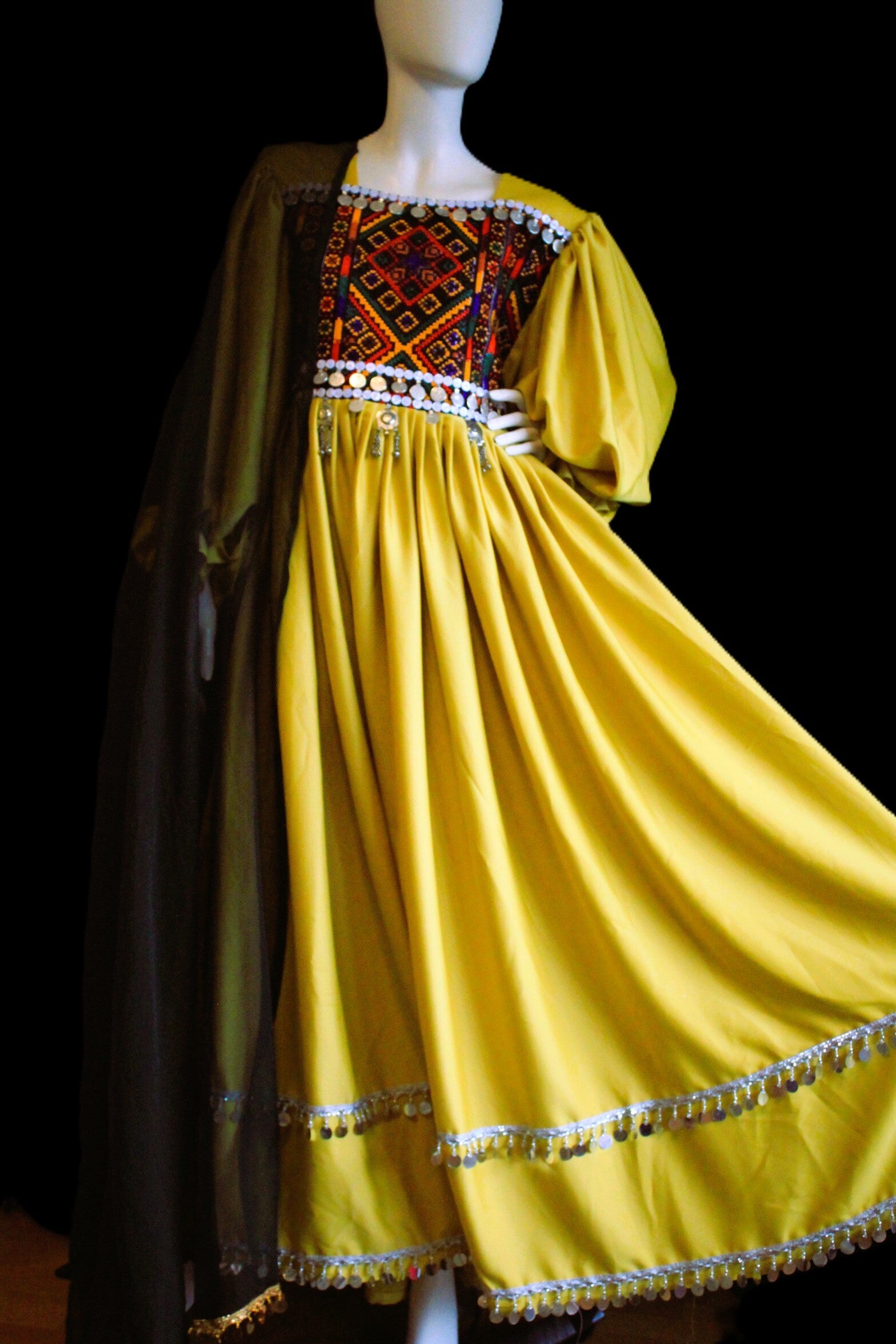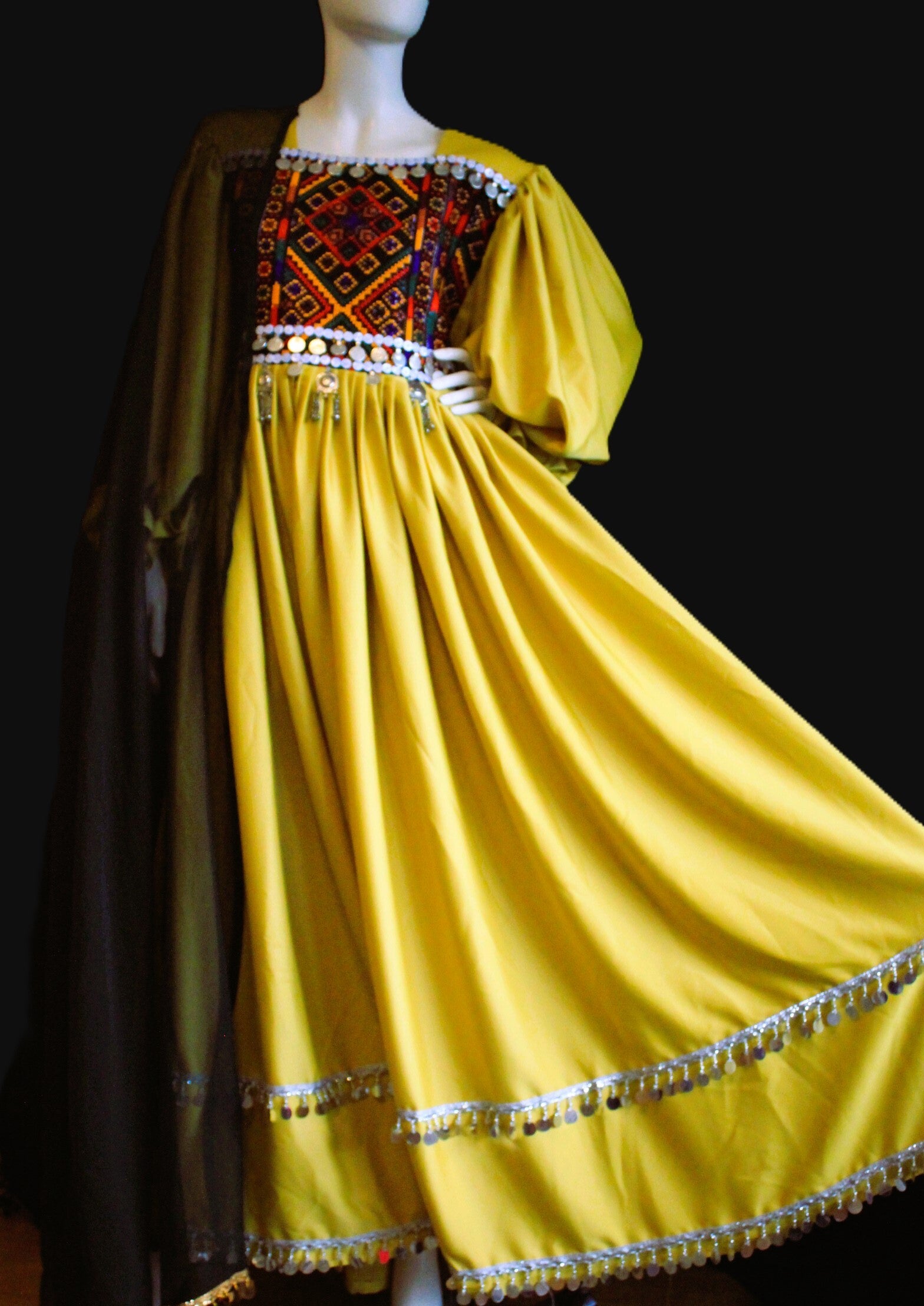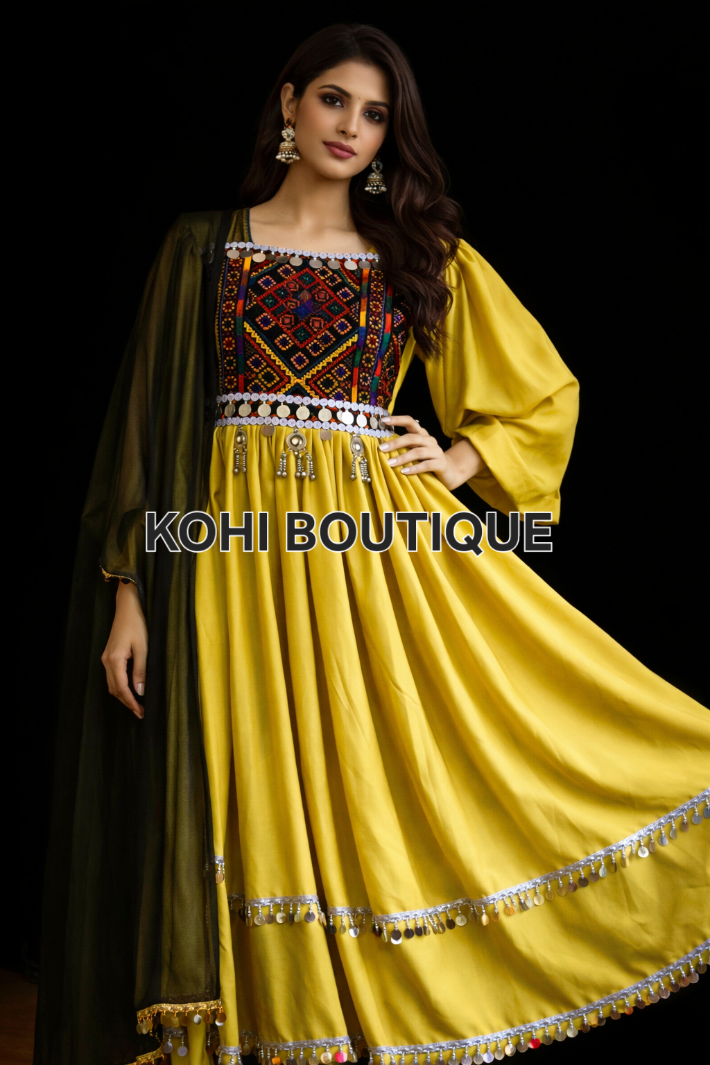 Denne vakre afghanske kjolen kombinerer tradisjonelt håndverk med tidløs eleganse. Kjolen er rikt dekorert med detaljerte broderier, speilornamenter og klassiske mønstre som gjenspeiler Afghanistans stolte kulturarv. Den luftige passformen og det myke stoffet gir et vakkert fall og høy komfort gjennom hele dagen.