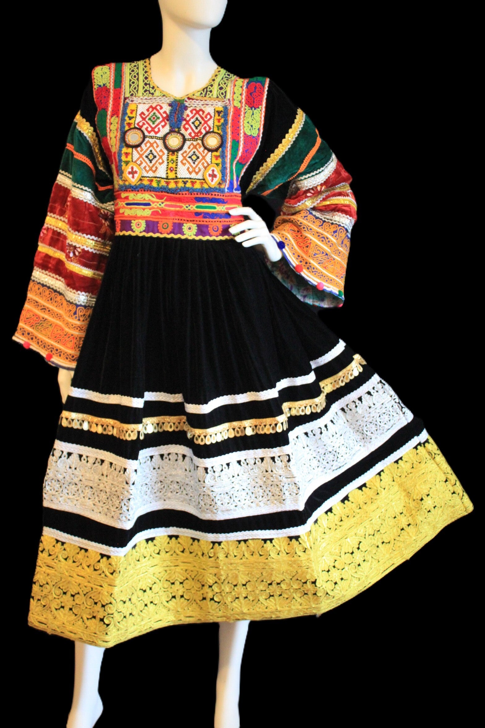 Overdelen er utsmykket med intrikate broderier i sterke, harmoniske farger som gir et eksklusivt uttrykk. Det vide skjørtet faller vakkert og gir både komfort og bevegelse, perfekt for festlige anledninger. De detaljerte ermene og den dekorative kanten gir kjolen et luksuriøst preg og gjør hvert plagg helt unikt.