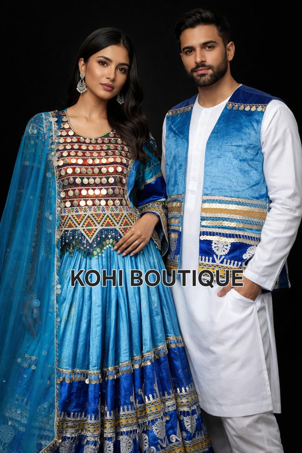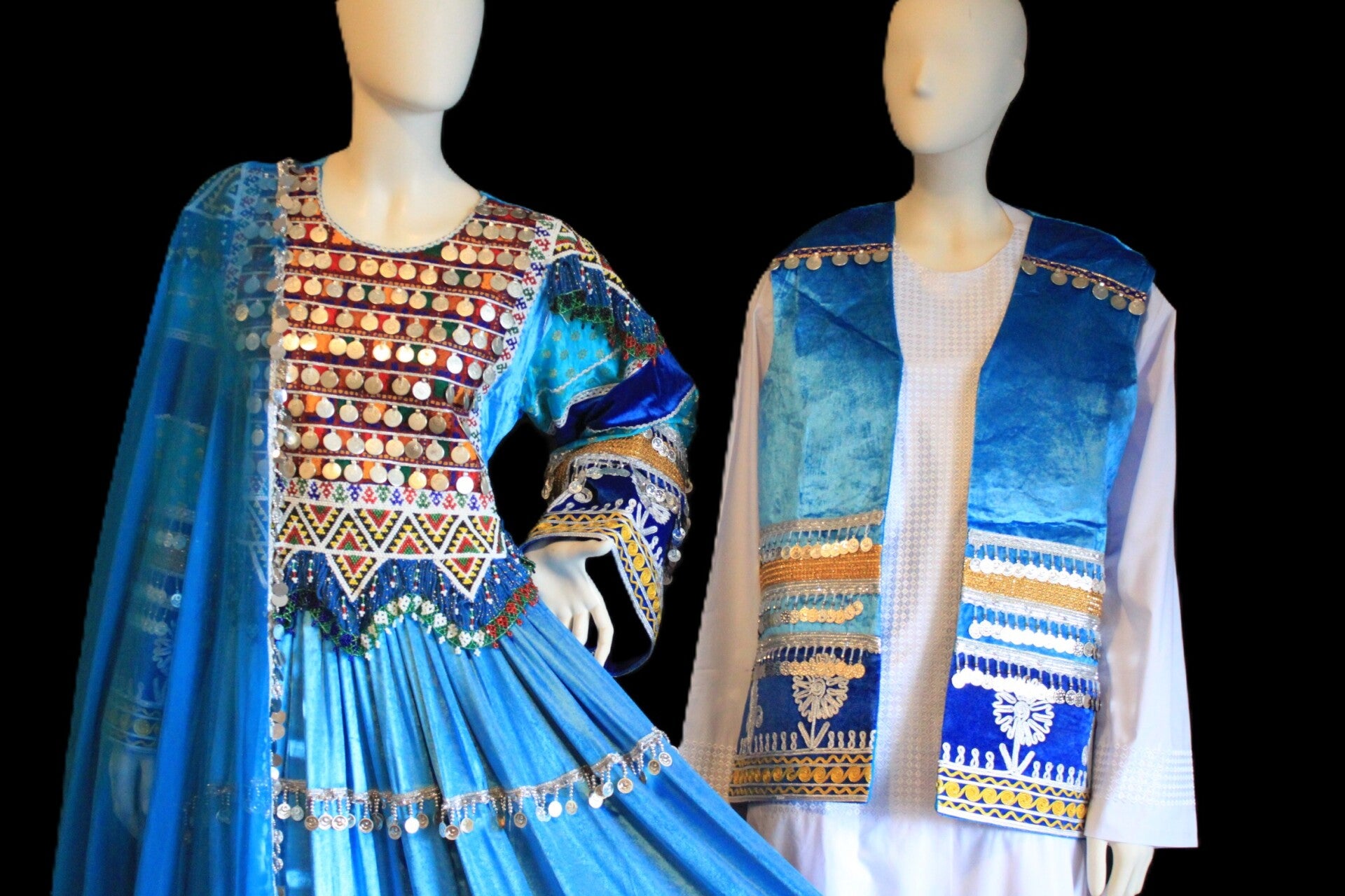 Håndbrodert afghansk kjole i blå toner – med matchende herrevest