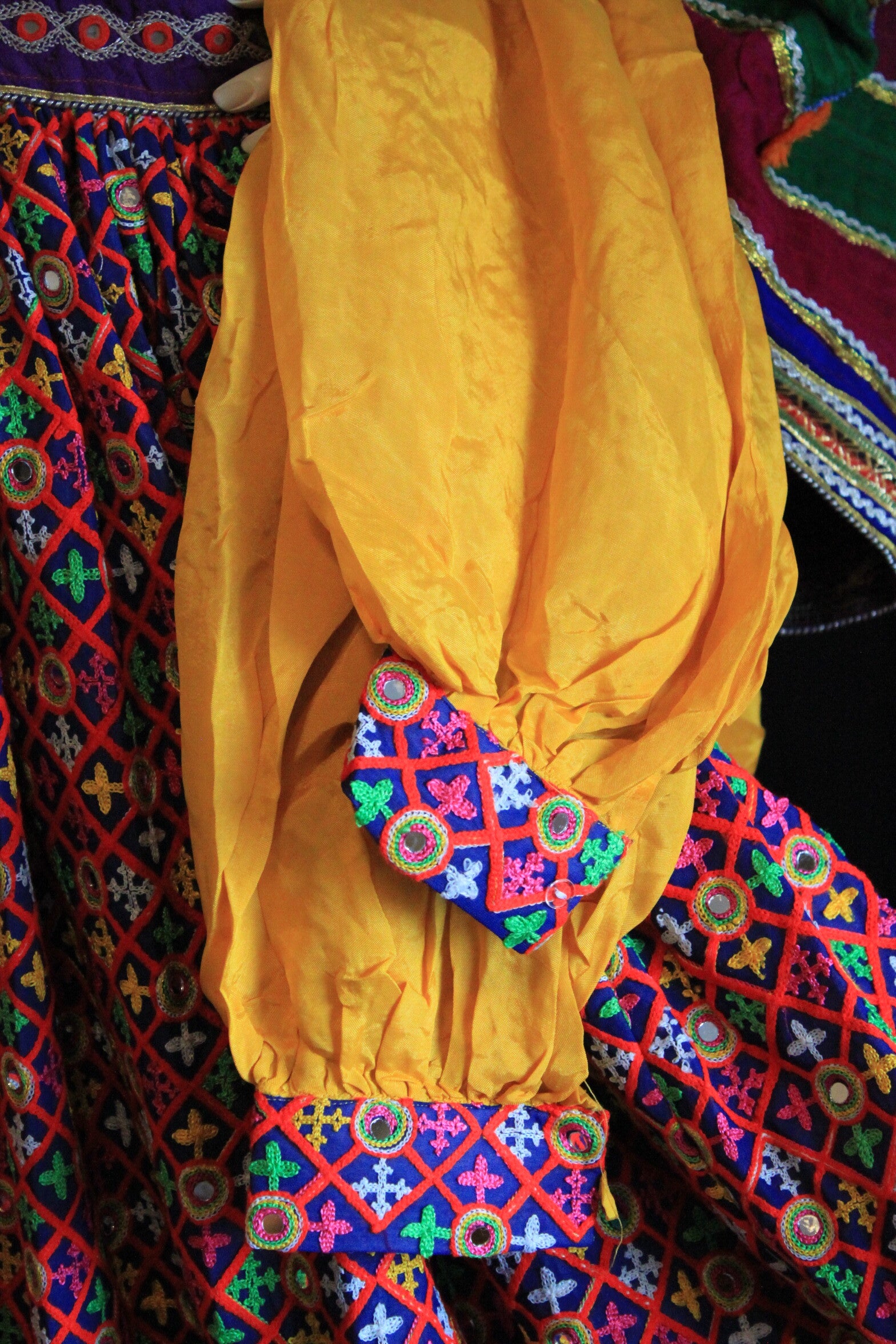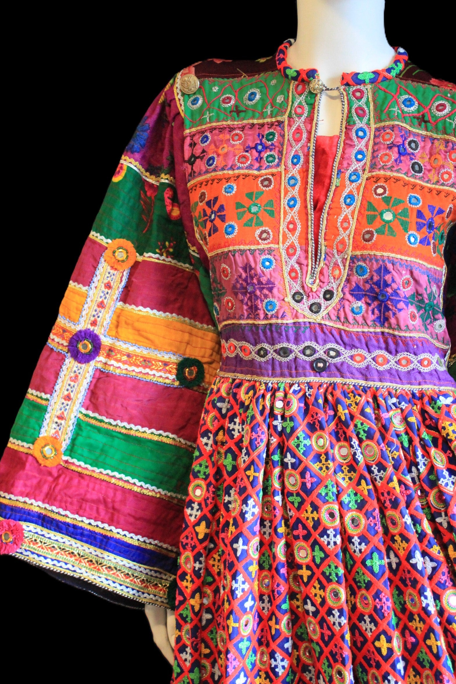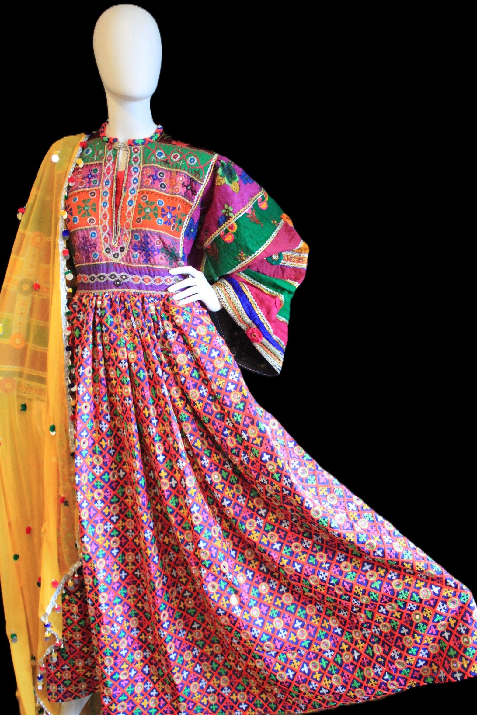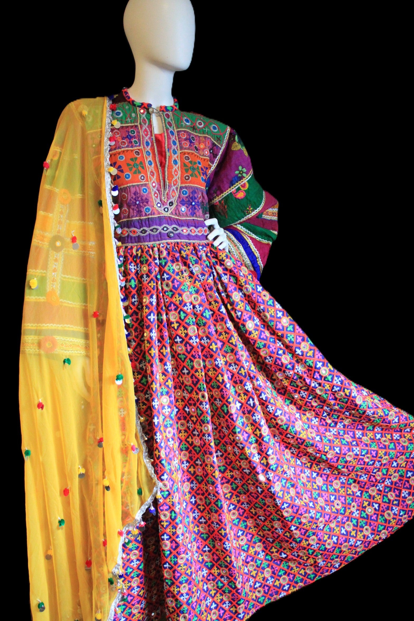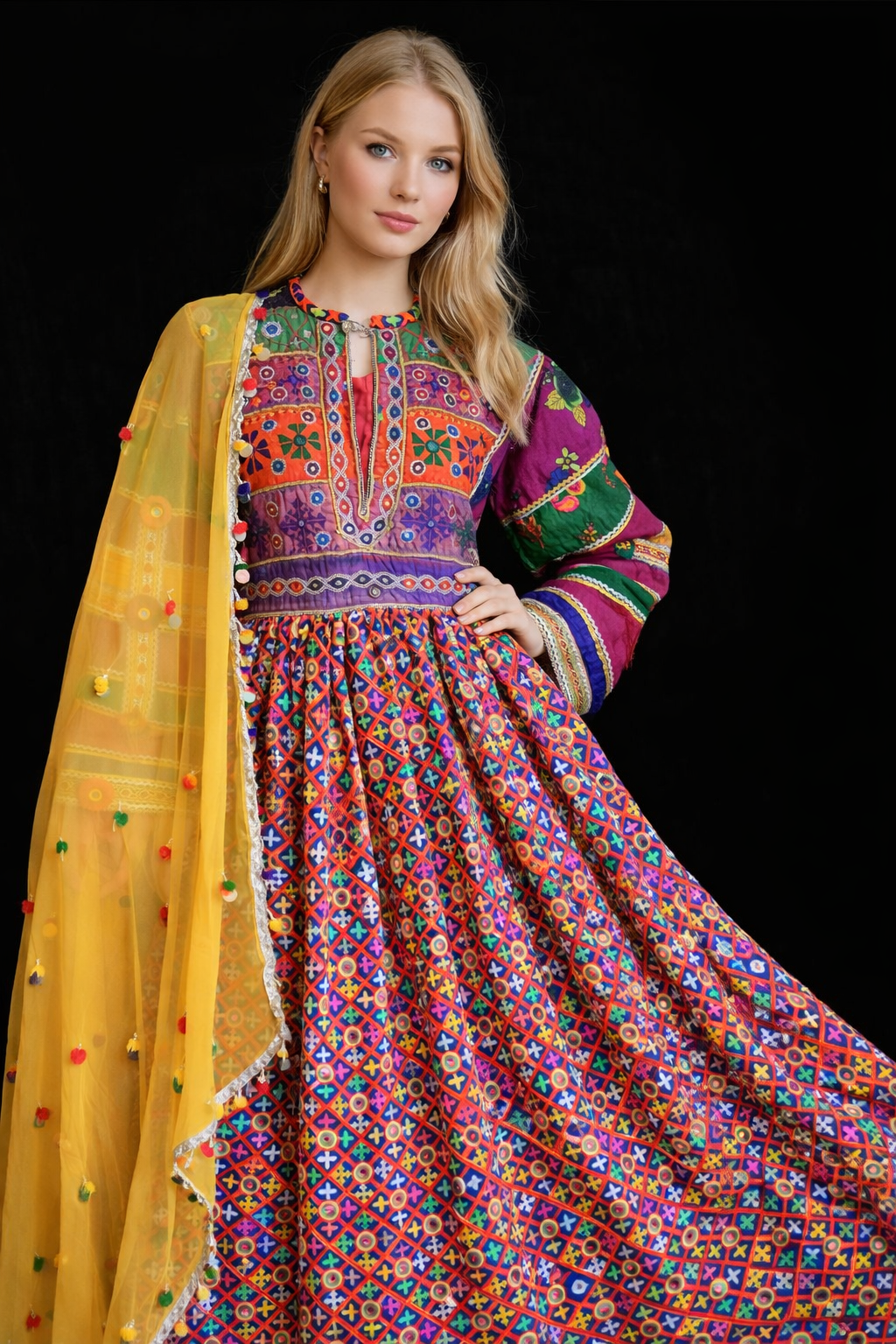 Denne unike afghanske kjolen kombinerer tradisjonelt håndverk med et elegant, moderne uttrykk. Kjolen er rikt dekorert med intrikate broderier i levende farger, inspirert av autentiske afghanske mønstre. Det voluminøse skjørtet gir et vakkert fall, mens overdelen er utsmykket med detaljer som gir et eksklusivt og festklart preg.