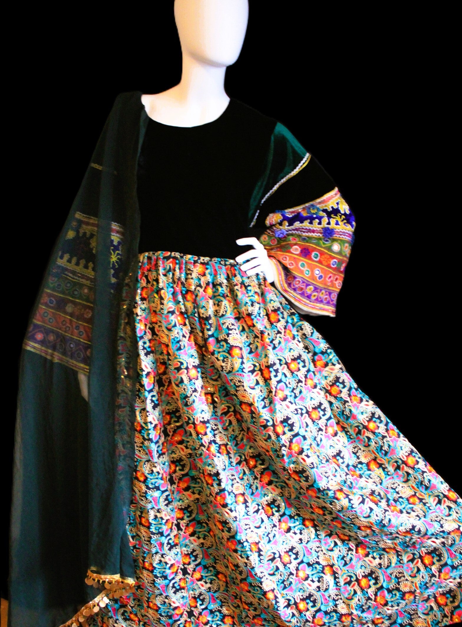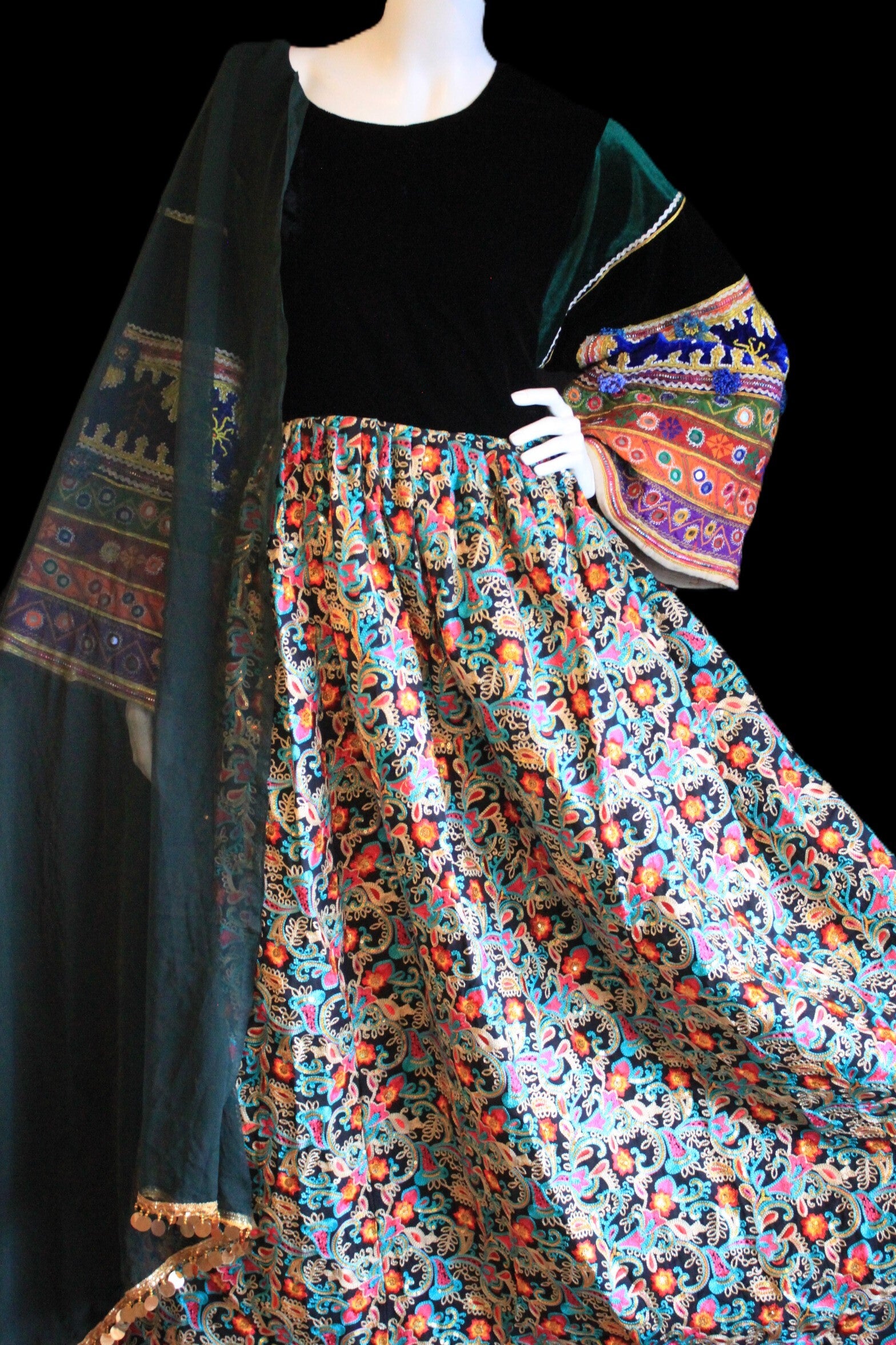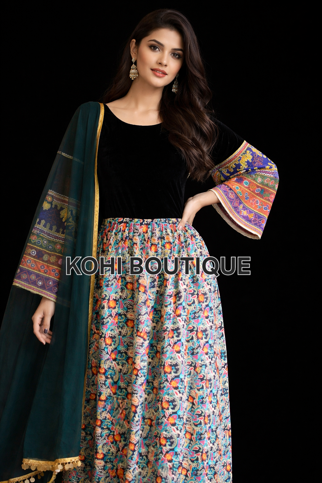Overdelen er utført i myk, mørk fløyel som gir et eksklusivt preg, mens skjørtet er rikt dekorert med fargerike, tradisjonelle mønstre som skaper et levende og elegant uttrykk. De detaljerte broderiene og de håndsydde elementene vitner om høy kvalitet og ekte håndverk.