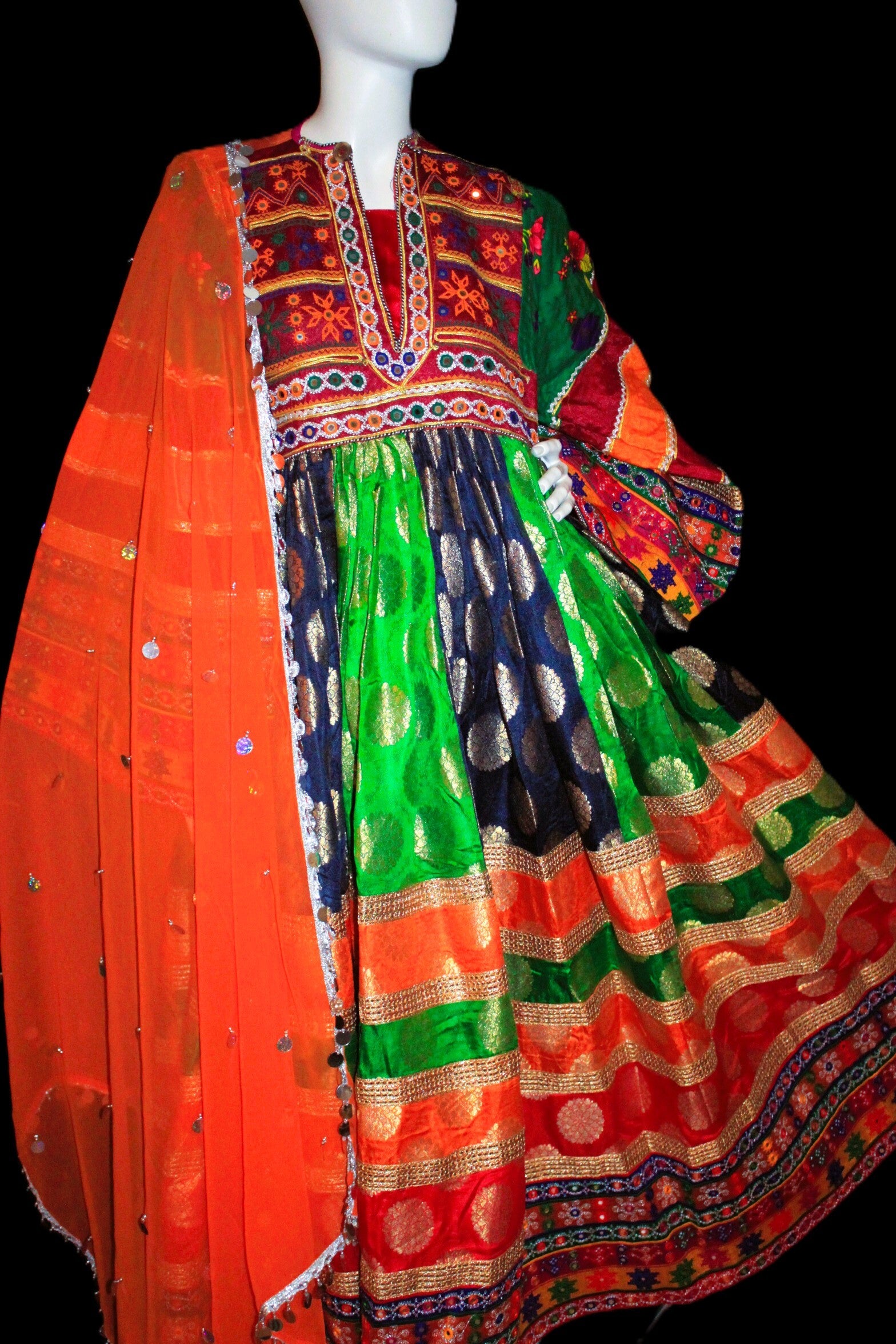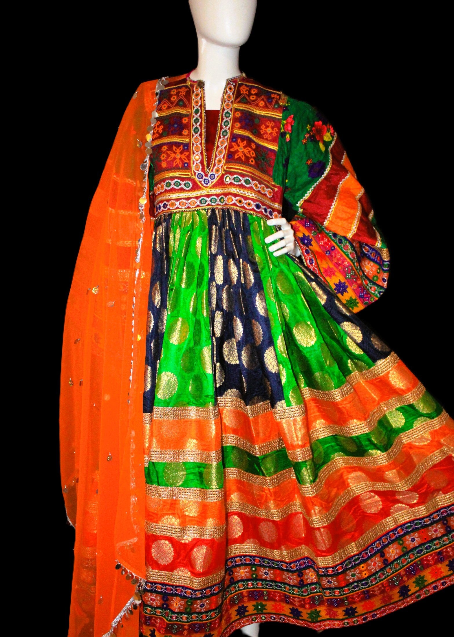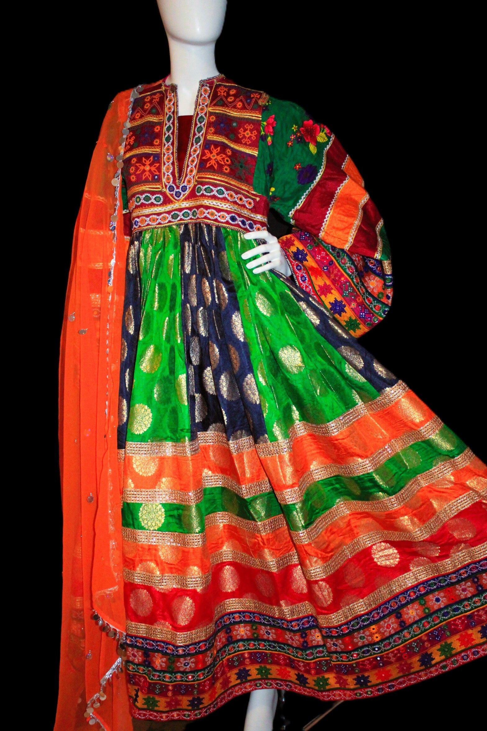 Kjolen kombinerer sterke farger med detaljerte, håndbroderte mønstre som gir et eksklusivt og elegant preg. Den matchende sjalen fullfører antrekket og tilfører en lett og elegant kontrast.