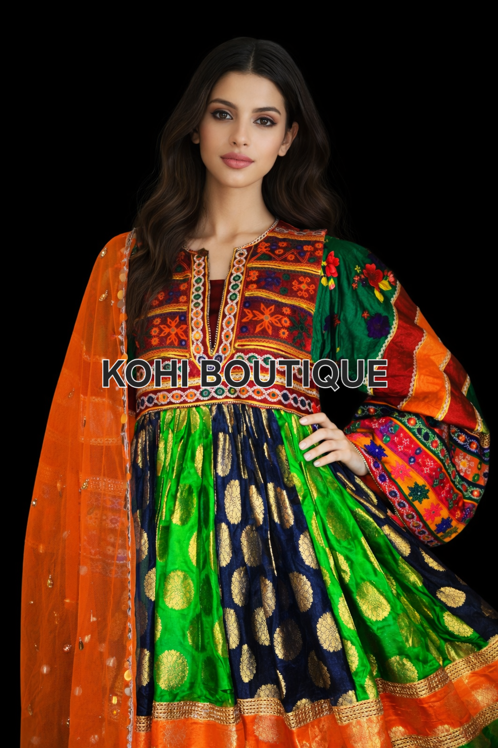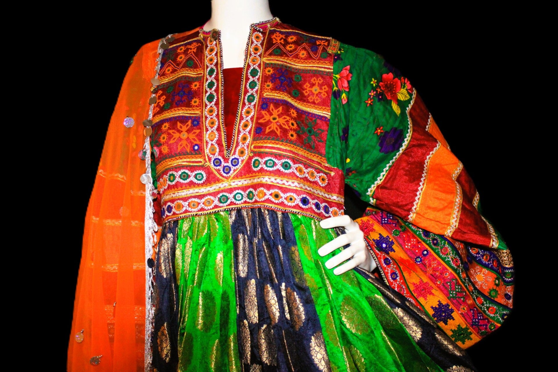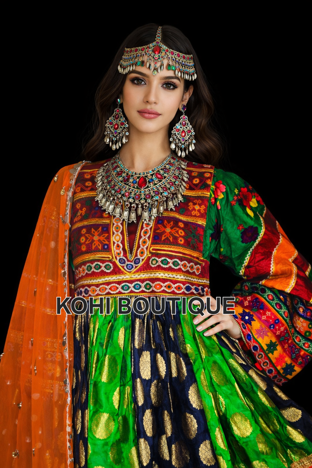 Kjolen kombinerer sterke farger med detaljerte, håndbroderte mønstre som gir et eksklusivt og elegant preg. Den matchende sjalen fullfører antrekket og tilfører en lett og elegant kontrast.
