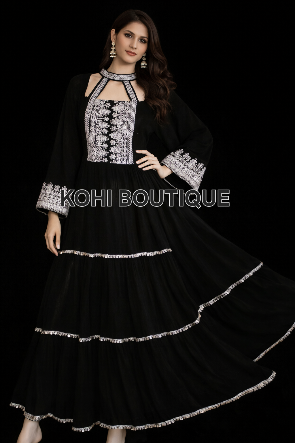 Elegant Sort Kjole med Sølvbroderi – Tidløs og Sofistikert