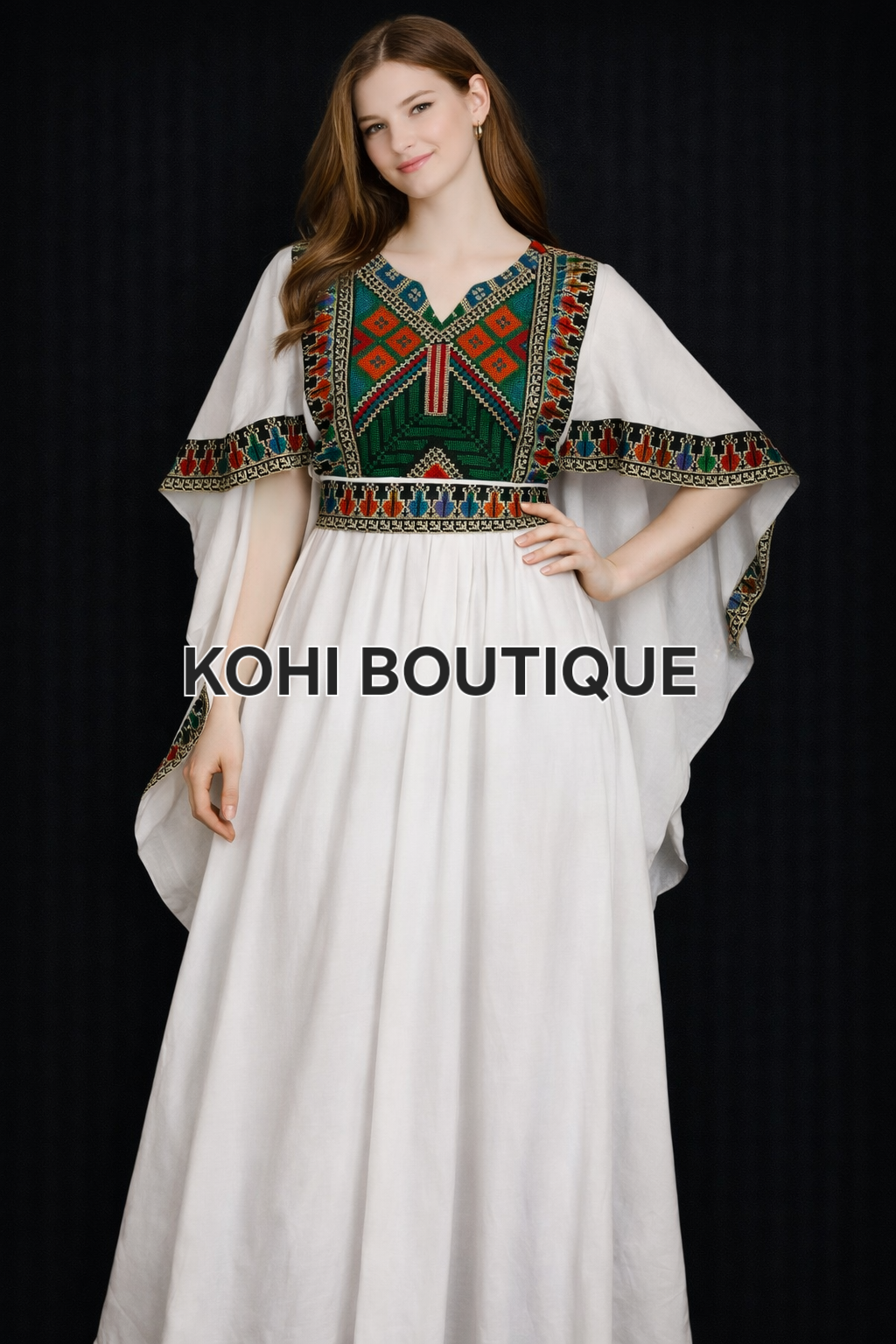 Overdelen er rikt dekorert med geometriske, håndbroderte mønstre i dype grønne, røde og blå toner, inspirert av tradisjonelle afghanske tekstiltradisjoner. De brede, flytende ermene gir kjolen et majestetisk preg og skaper en elegant silhuett i bevegelse. Den lange, vide skjørtelengden gir komfort samtidig som den utstråler eksklusivitet.