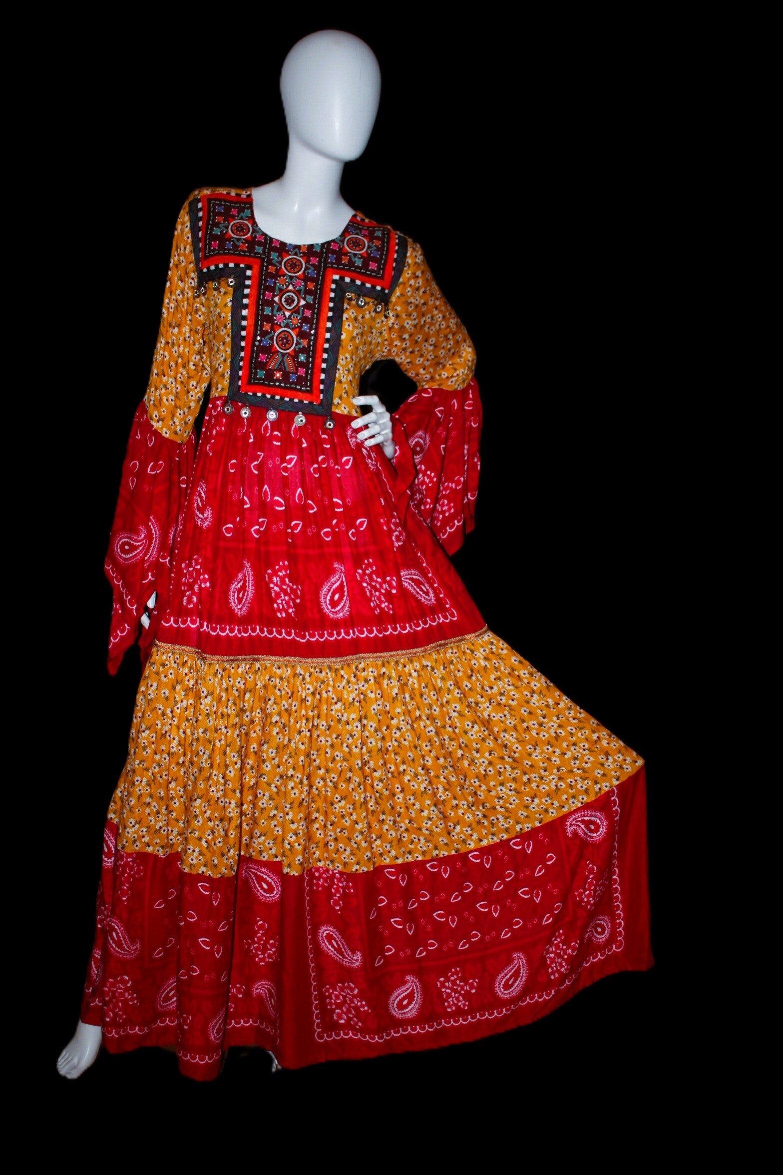 Maxikjole med dekorative mønstre og brodert brystparti
