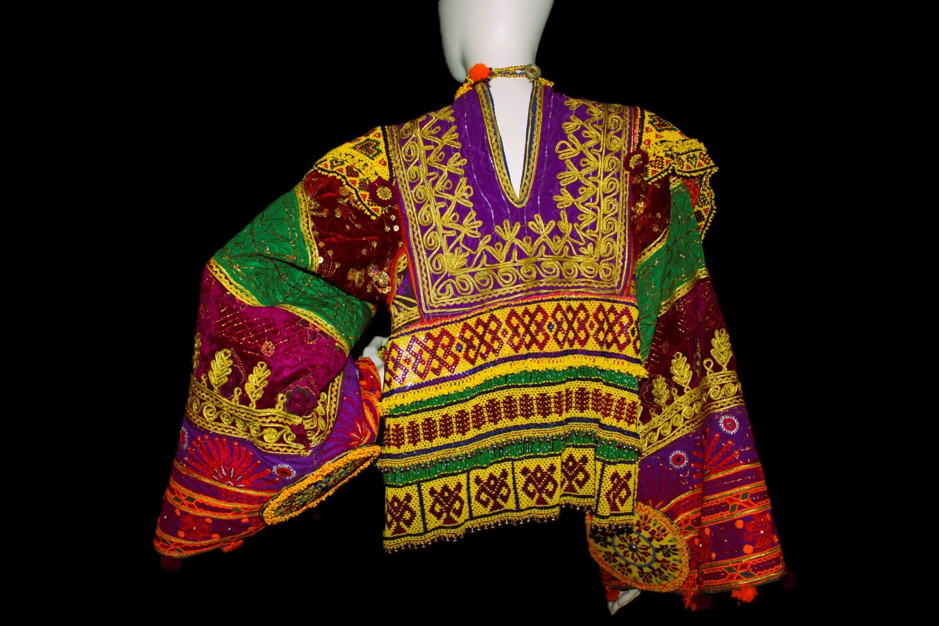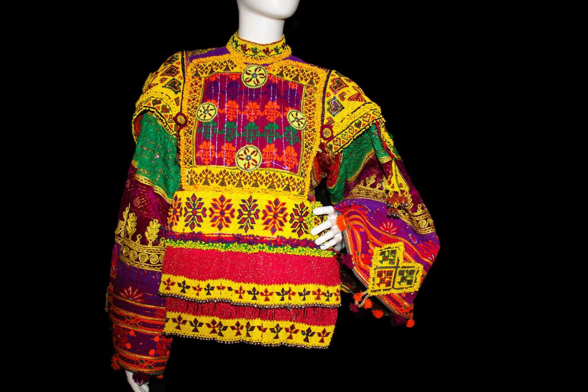 blusen er et mesterverk av tradisjonelt håndverk og kraftfull design. Med sitt overdådige broderi i gyllent gult, dype røde toner, grønt og lilla, fremstår plagget som et kunstobjekt i seg selv. Hver detalj er nøye utformet og vitner om tid, presisjon og ekte håndverk.