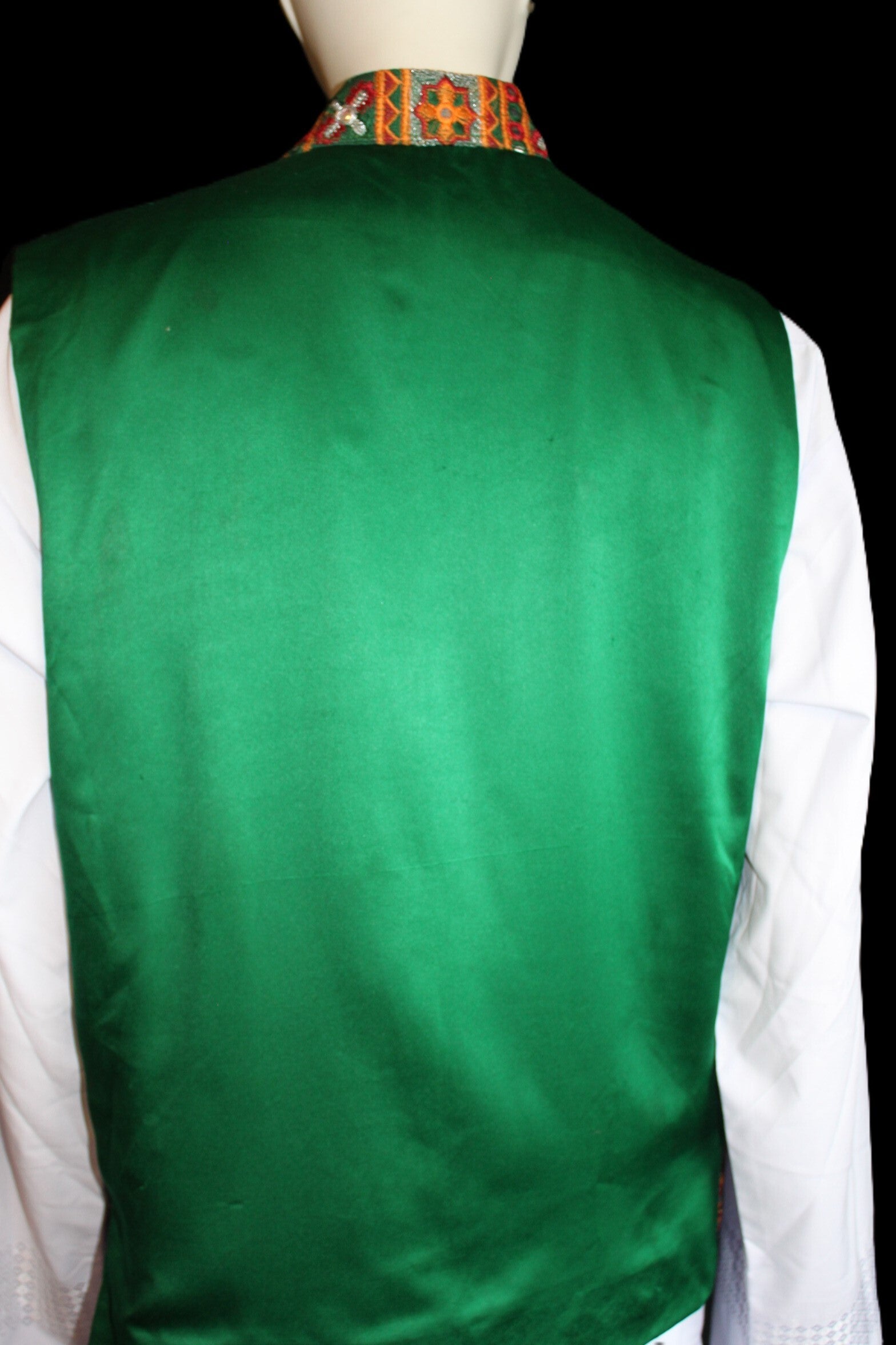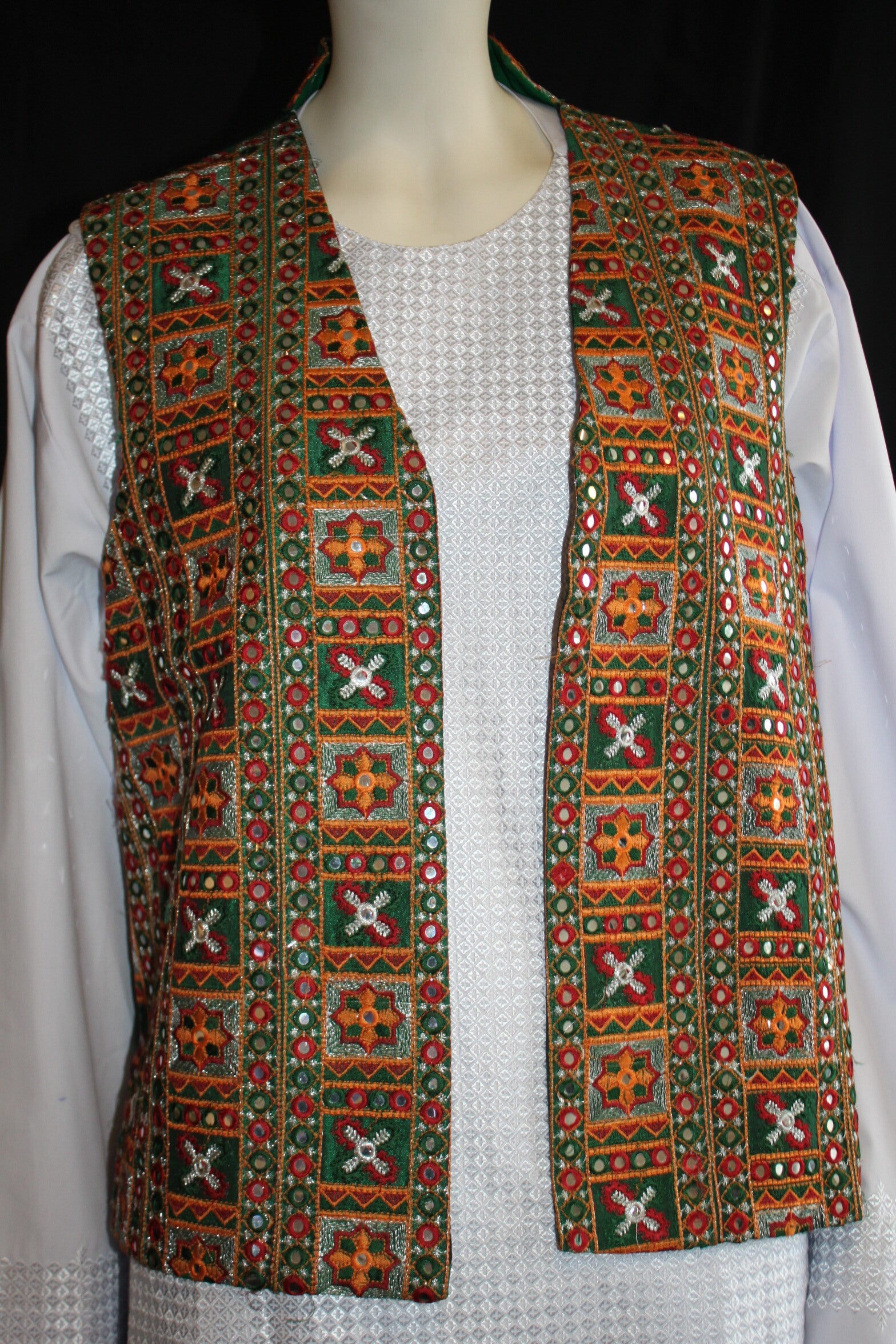 Rikt dekorert front med tradisjonelle broderier og speildetaljer